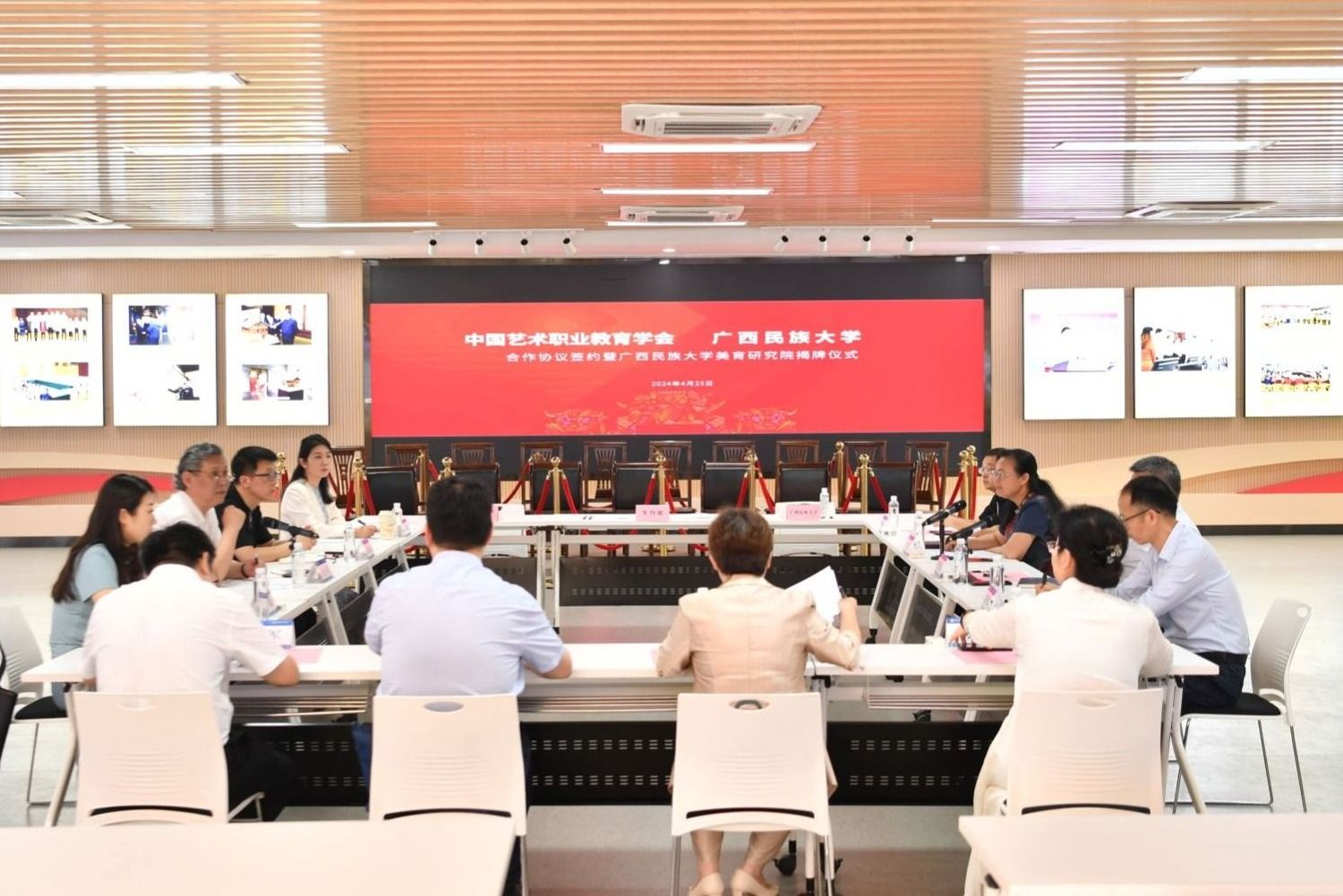 【大學生通訊社報道】4月25日上午,廣西民族大學美育研究院揭牌儀式在新時代“我與祖國共成長”黨團主題活動文明實踐所舉行。廣西民族大學校長韋仕珍,中國藝術職業教育學會會長王豐簽訂合作框架協議,共同為廣西民族大學美育研究院揭牌。校黨委副書記陳銘彬主持活動。