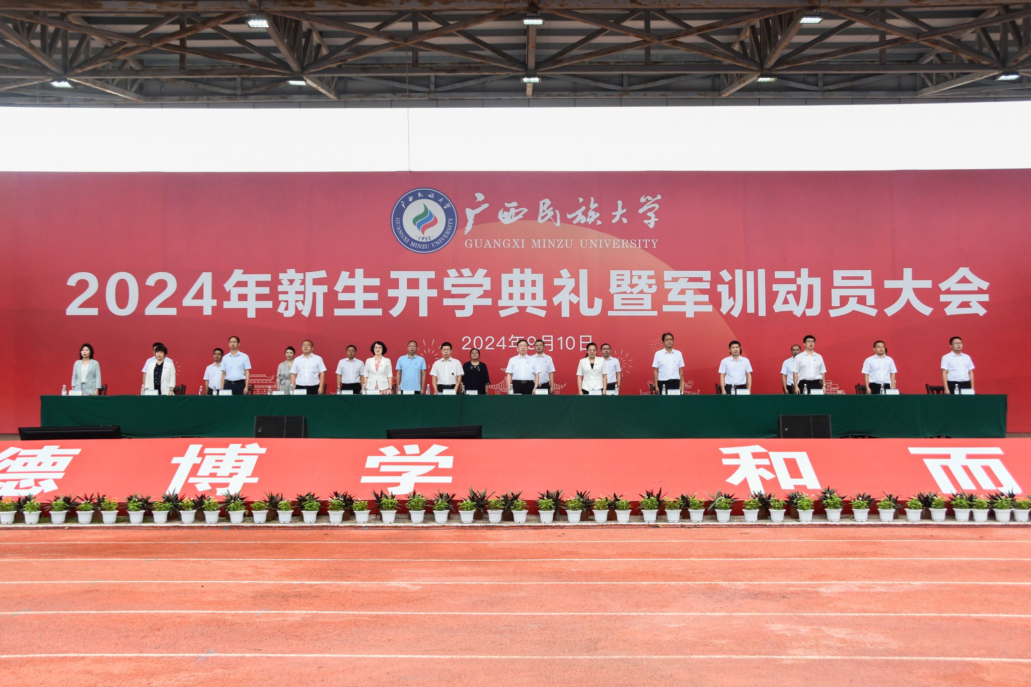 【大學生通訊社報道】9月10日上午,廣西民族大學2024年新生開學典禮暨軍訓動員大會在思源湖校區李寧田徑場、相思湖校區田徑場、武鳴校區體育館同步舉行。學校黨委書記卞成林,校長韋仕珍,校領導陳銘彬、鄧國彬、蔡高根、黃曉娟、呂俊彪、何立榮、姜明國、高興宇,學校有關職能部門、各學院負責人,教師代表,2024級全體新生參加典禮。