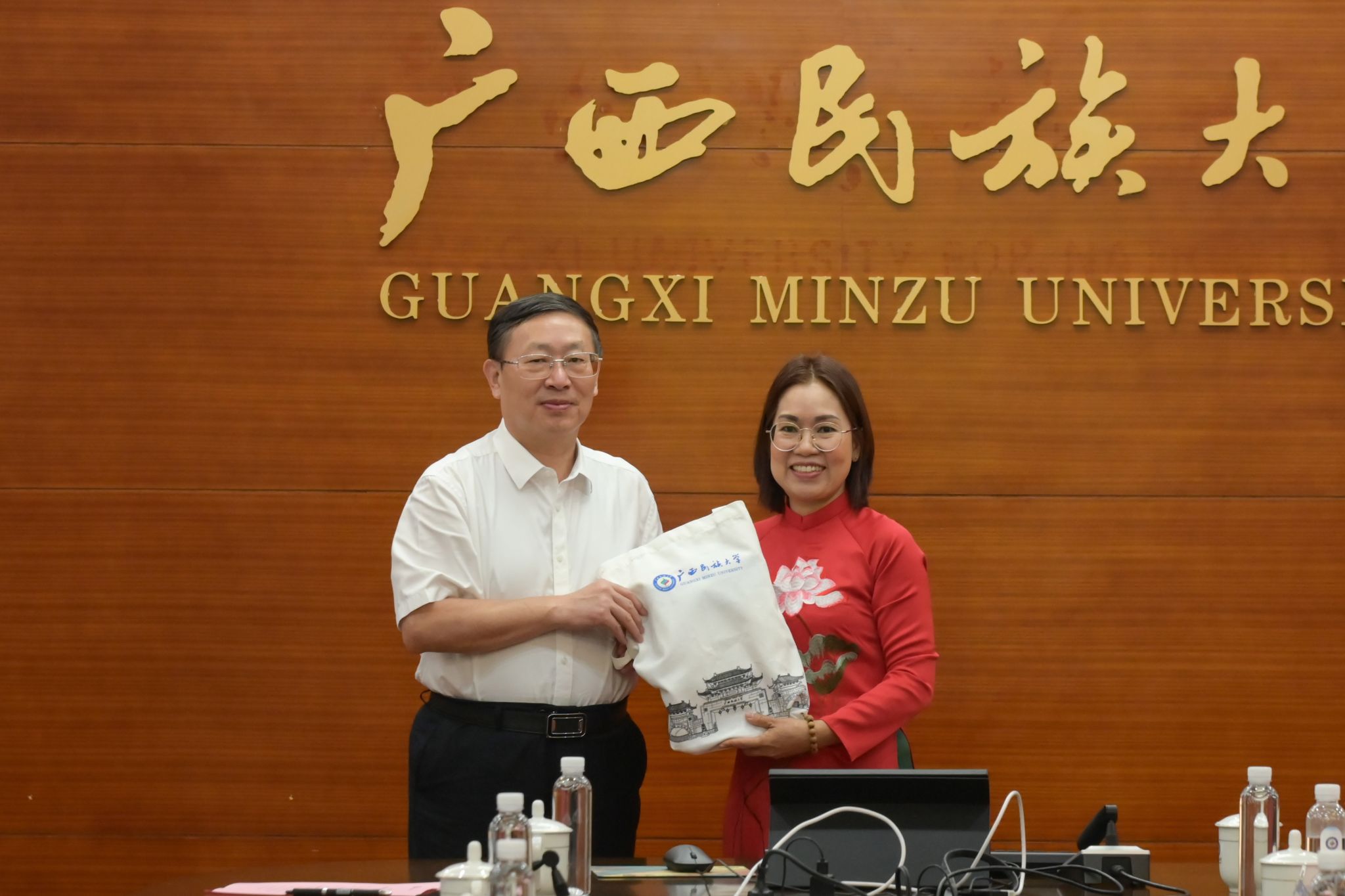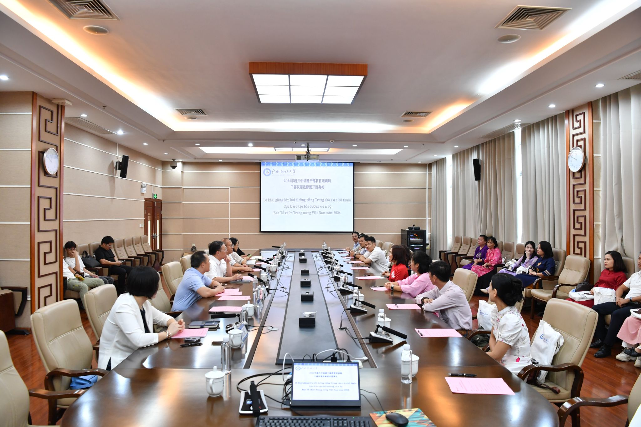 【大學生通訊社報道】9月11日上午,2024年越共中央組織部干部教育培訓局干部漢語進修班開班典禮在廣西民族大學國際教育綜合樓一樓會議室舉行。廣西民族大學黨委書記卞成林,黨委常委、副校長姜明國出席,越共中央組織部干部教育培訓局干部漢語進修班全體學員參加。