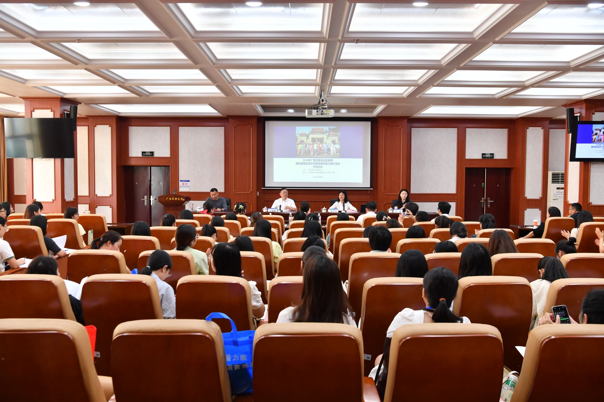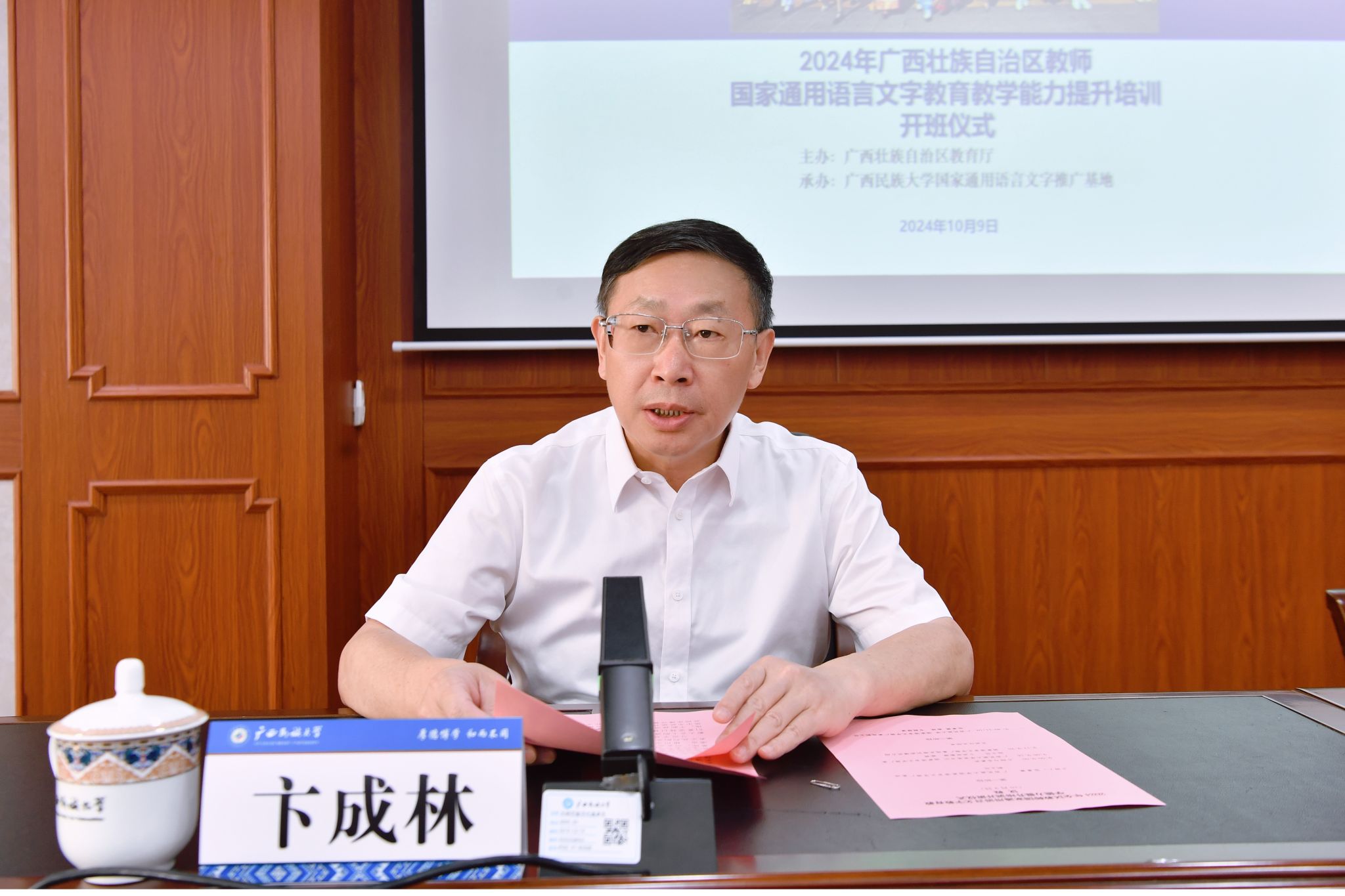 10月9日上午,2024年廣西壯族自治區教師國家通用語言文字教育教學能力提升培訓班(線下)在廣西民族大學開班。廣西民族大學黨委書記、國家語言文字推廣基地(廣西民族大學)主任卞成林教授出席開班儀式并講話。全區中小學、幼兒園教師代表及參與管理、指導本地中華經典誦寫講活動骨干教師參加培訓。