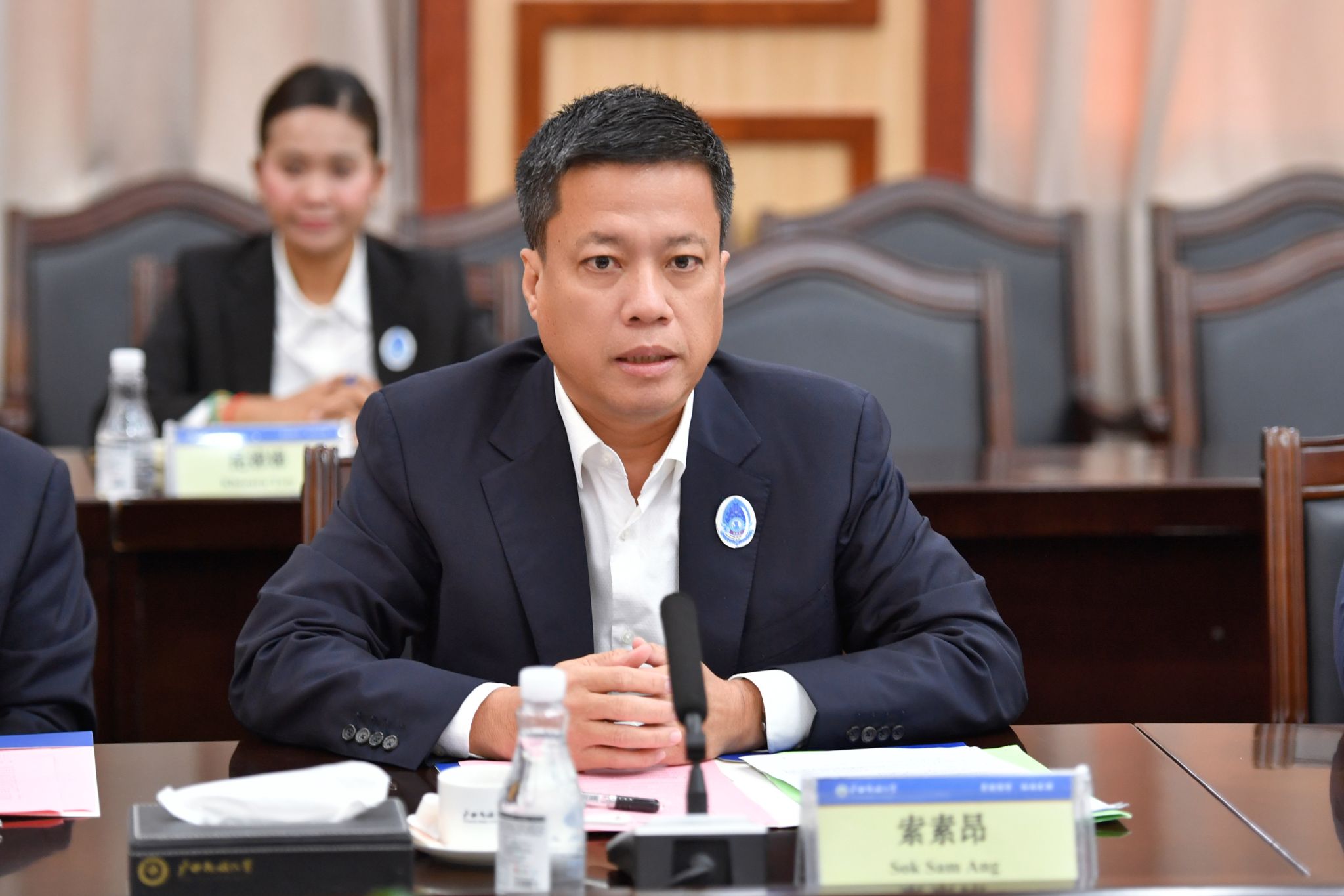 索素昂對韋仕珍校長的熱情招待表示感謝。他表示,柬中兩國交往歷史悠久,今年是柬中兩國建交66周年和柬中人文交流年,雙方展開了不同領域的交流合作。此次代表團到訪廣西民族大學旨在進一步擴展獎學金項目的合作機會,確保獎學金項目的可持續性,維持雙方長期穩定的合作,為柬埔寨學生能夠來到廣西繼續深造尋找更多機會。