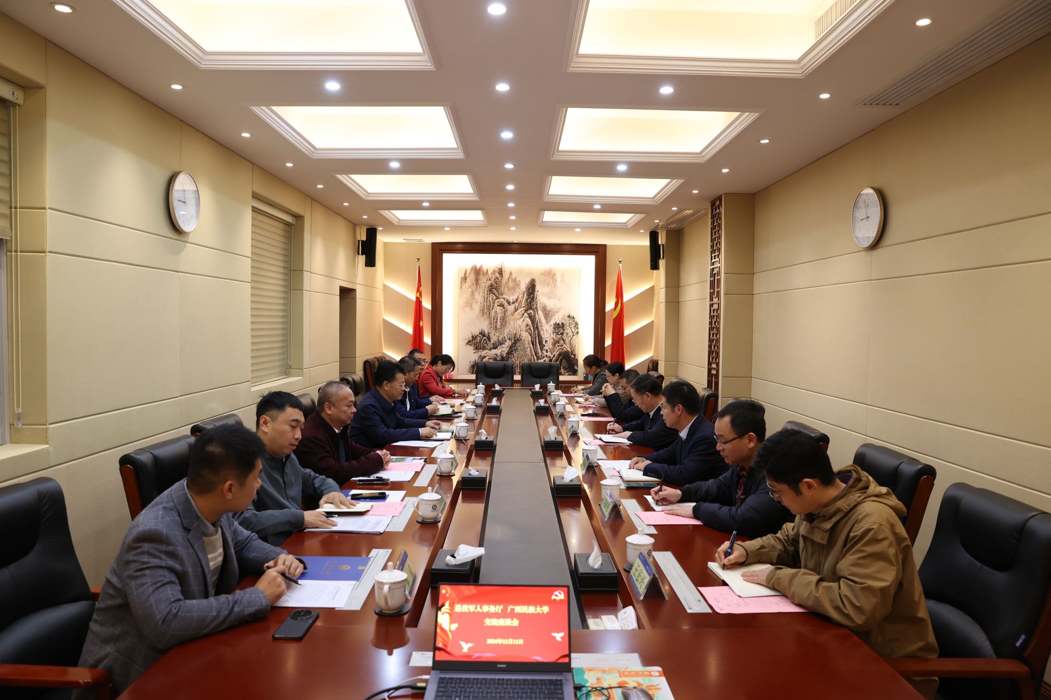 【大學生通訊社報道】12月11日上午,廣西民族大學黨委書記卞成林會見來校交流的自治區退役軍人事務廳黨組書記、廳長黃衛平一行。雙方在辦公樓211室舉行座談會。學校黨委副書記鄧國彬參加座談會。