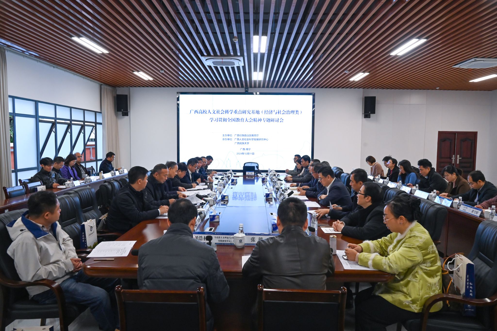 12月11日上午,由自治區(qū)教育廳主辦,廣西人文社會(huì)科學(xué)發(fā)展研究中心和廣西民族大學(xué)共同承辦的廣西高校人文社會(huì)科學(xué)重點(diǎn)研究基地(經(jīng)濟(jì)與社會(huì)治理類(lèi))學(xué)習(xí)貫徹全國(guó)教育大會(huì)精神專(zhuān)題研討會(huì)在廣西民族大學(xué)舉行。會(huì)前,廣西民族大學(xué)黨委書(shū)記卞成林陪同與會(huì)專(zhuān)家學(xué)者參觀(guān)廣西中華民族共同體意識(shí)研究院。