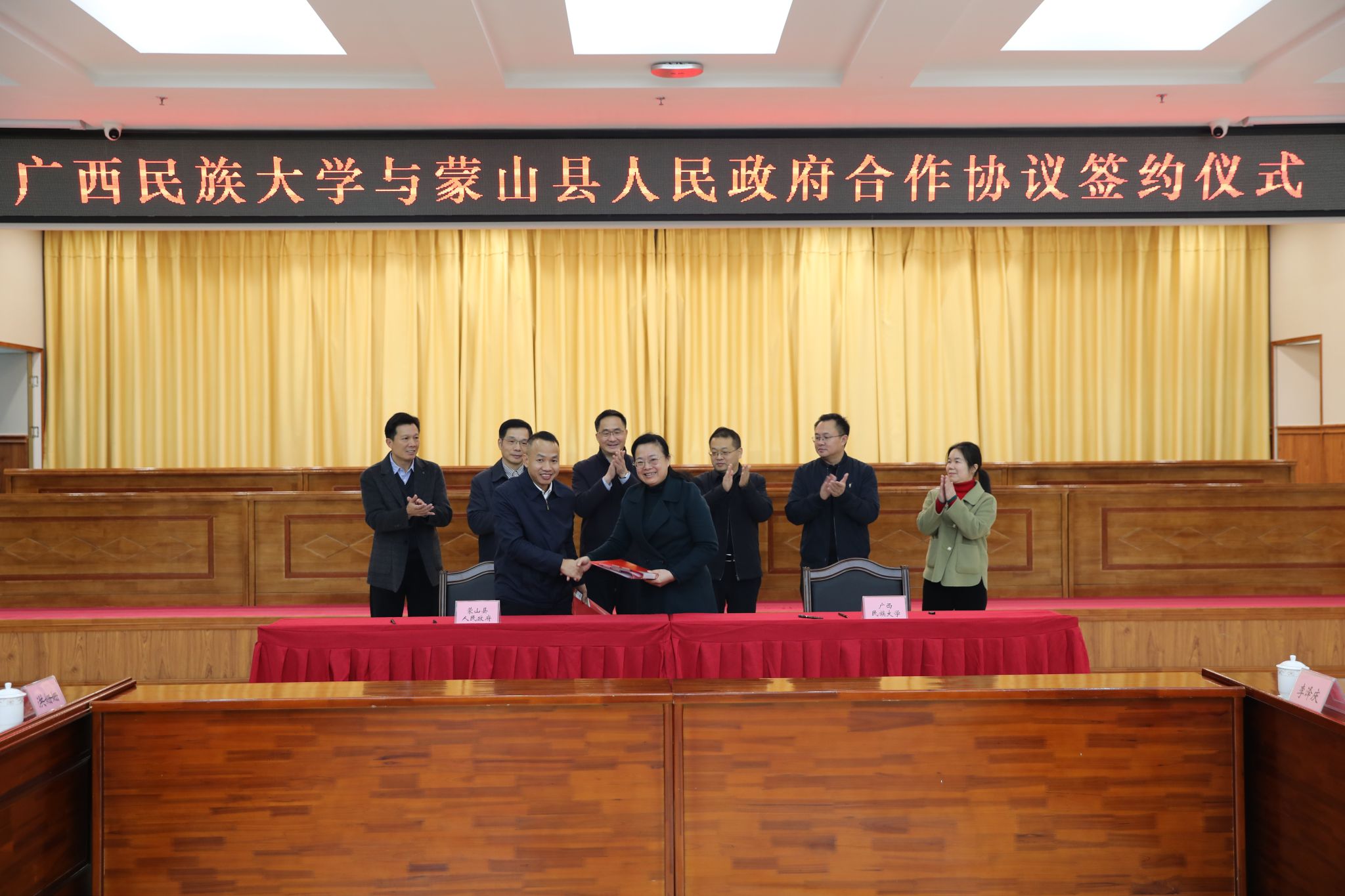 13日,廣西民族大學與梧州市蒙山縣人民政府合作協議簽約儀式在蒙山縣人民政府辦公樓舉行。韋仕珍、蒙山縣委書記張銀岳、縣人大常委會主任何健出席儀式。蒙山縣委常委、統戰部部長、副縣長韓格主持簽約儀式。