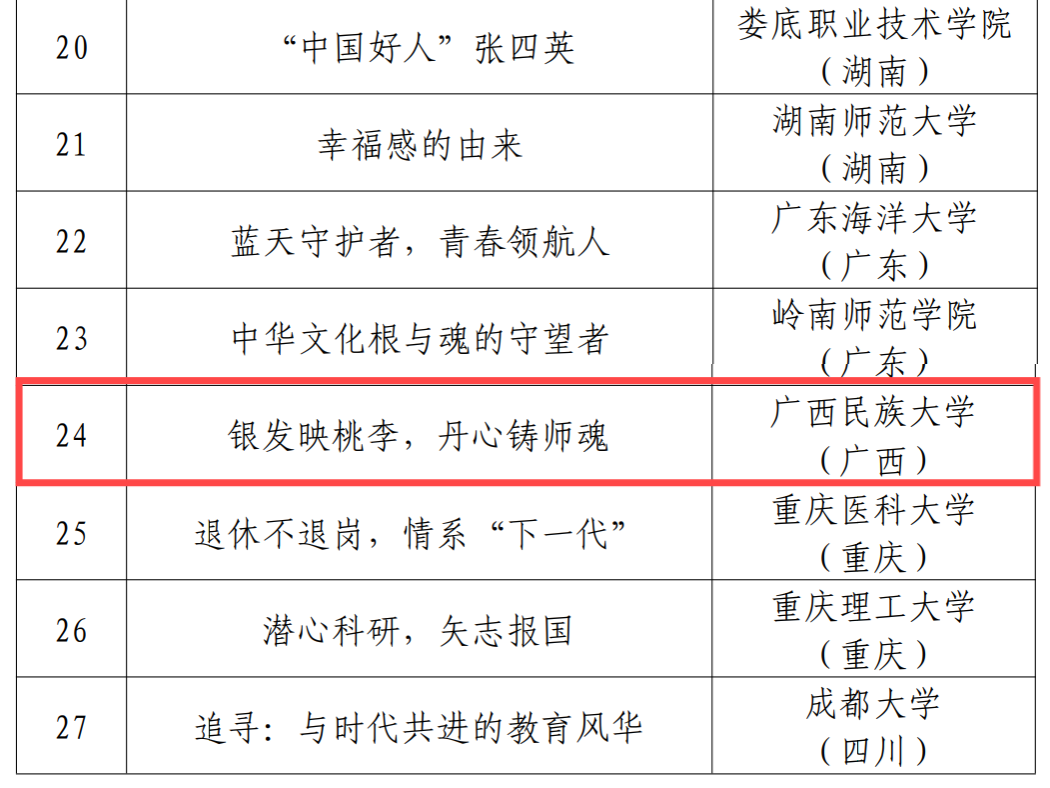 近日,教育部關工委公布2024年“讀懂中國”活動入選作品名單。由廣西民族大學關工委、廣西民族大學融媒體中心制作的微視頻《銀發映桃李,丹心鑄師魂》獲優秀微視頻獎。獲獎視頻講述我校退休教師黃在銀創辦“樂米夢想家”工作室,以滿腔的熱情和負責的態度投入到科研創新中,助力學校發展和培養優秀人才。