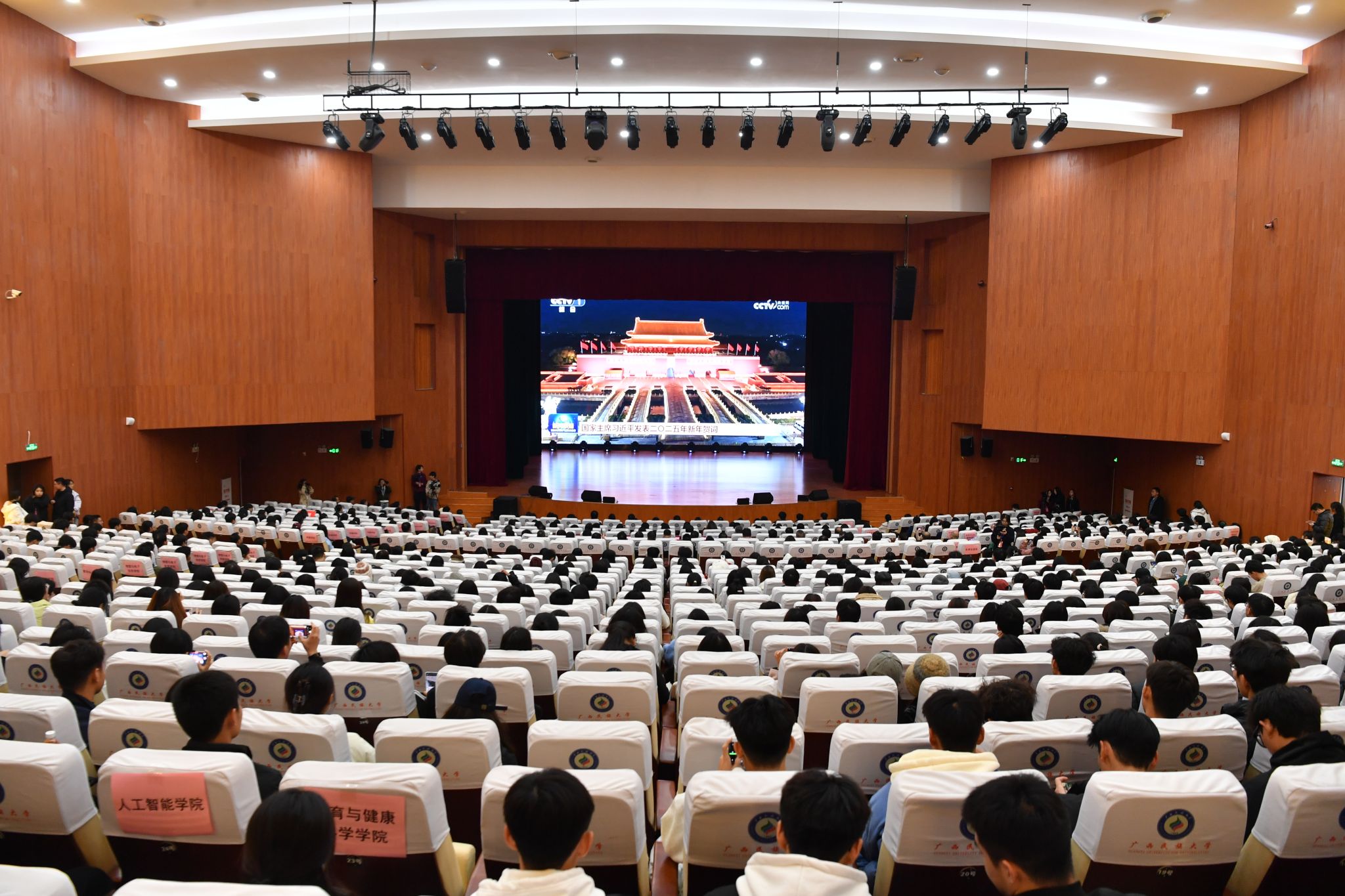 【大學(xué)生通訊社報(bào)道】國家主席習(xí)近平于今晚7時(shí)通過中央廣播電視總臺(tái)和互聯(lián)網(wǎng),發(fā)表二〇二五年新年賀詞。廣西民族大學(xué)校領(lǐng)導(dǎo)和各族師生代表在思源湖校區(qū)大學(xué)生活動(dòng)中心禮堂集中收看直播。