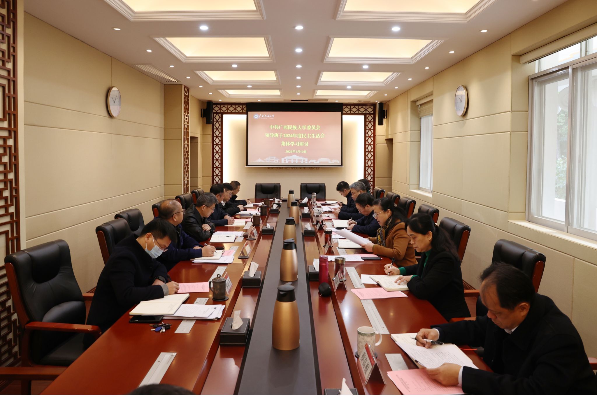 1月10日上午,廣西民族大學黨委領導班子開展2024年度民主生活會集體學習研討,深入學習領會習近平新時代中國特色社會主義思想,一體學習貫徹習近平總書記關于黨的建設的重要思想、關于黨的自我革命的重要思想、關于全面加強黨的紀律建設的重要論述和關于廣西工作論述的重要要求,重點學習習近平總書記在中共中央政治局民主生活會上的重要講話精神,對照民主生活會要求檢查剖析,深化思想認識,切實把思想和行動統一到黨中央決策部署上來,進一步打牢開好民主生活會的思想基礎。學校黨委書記卞成林主持并講話。學校黨委副書記、校長韋仕珍等黨員領導干部參加。
