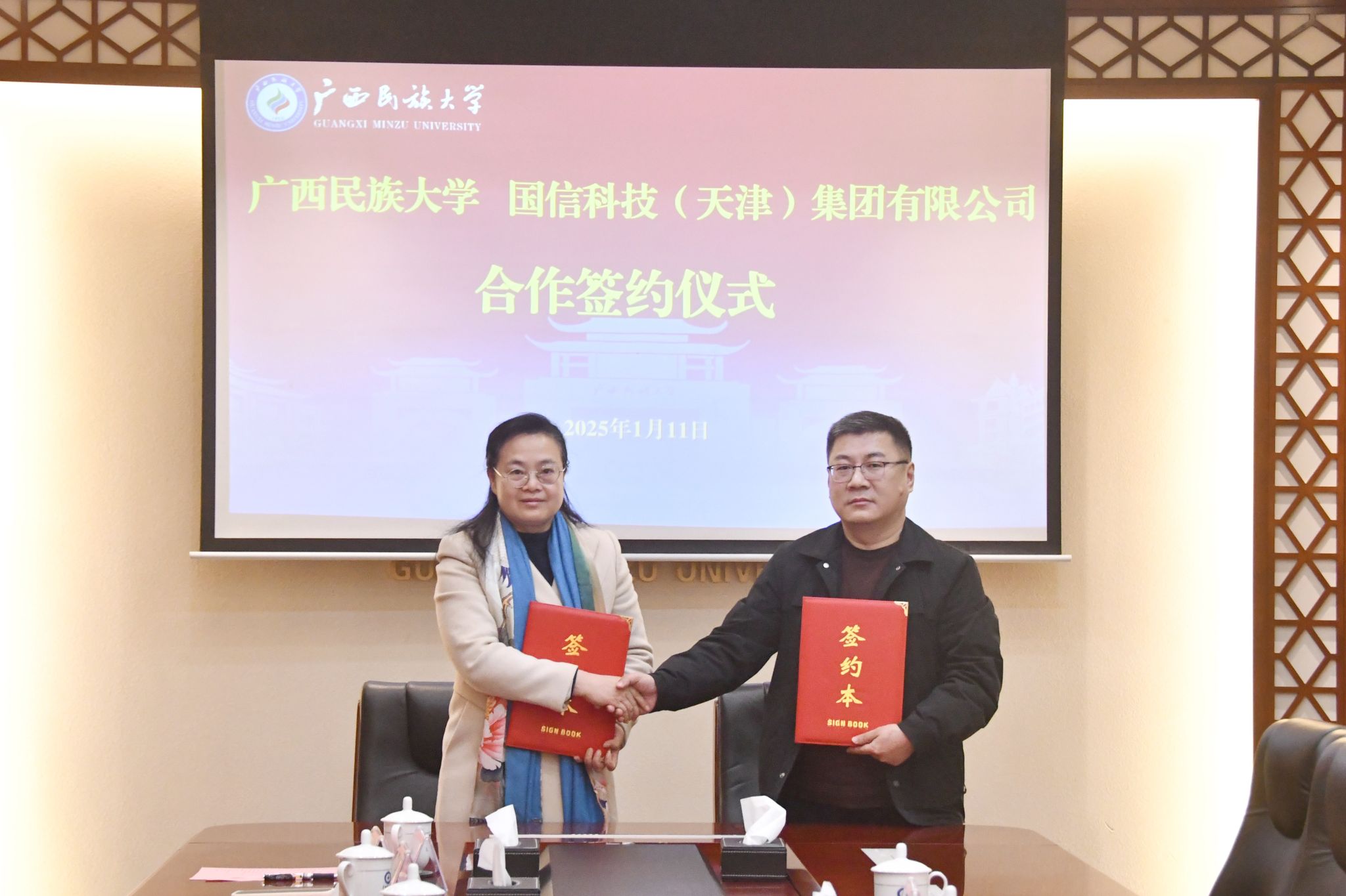 【大學生通訊社報道】1月11日下午,廣西民族大學與國信科技(天津)集團有限公司合作簽約儀式在辦公樓211會議室舉行。校長韋仕珍、國信科技(天津)集團有限公司國際現代農業及醫療健康事業部首席執行官唐曉春等出席簽約儀式,副校長高興宇主持儀式,學校科學技術處、發展規劃處及有關理工科學院負責人參會。
