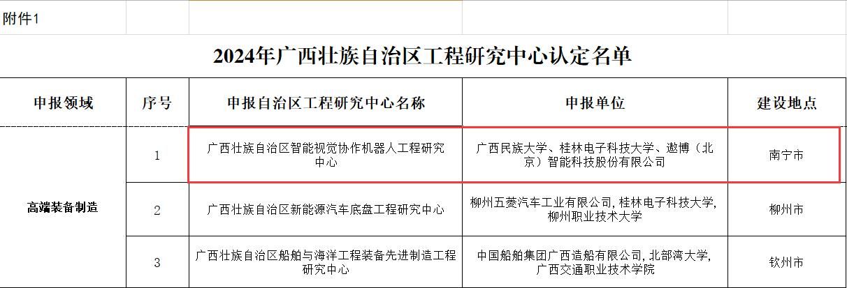 近日,廣西壯族自治區發展和改革委員會公布了2024年廣西工程研究中心認定名單,由廣西民族大學牽頭,與桂林電子科技大學、遨博(北京)智能科技股份有限公司聯合共建的“廣西壯族自治區智能視覺協作機器人工程研究中心”獲得認定,這是我校首次以第一申報單位獲批的廣西工程研究中心。