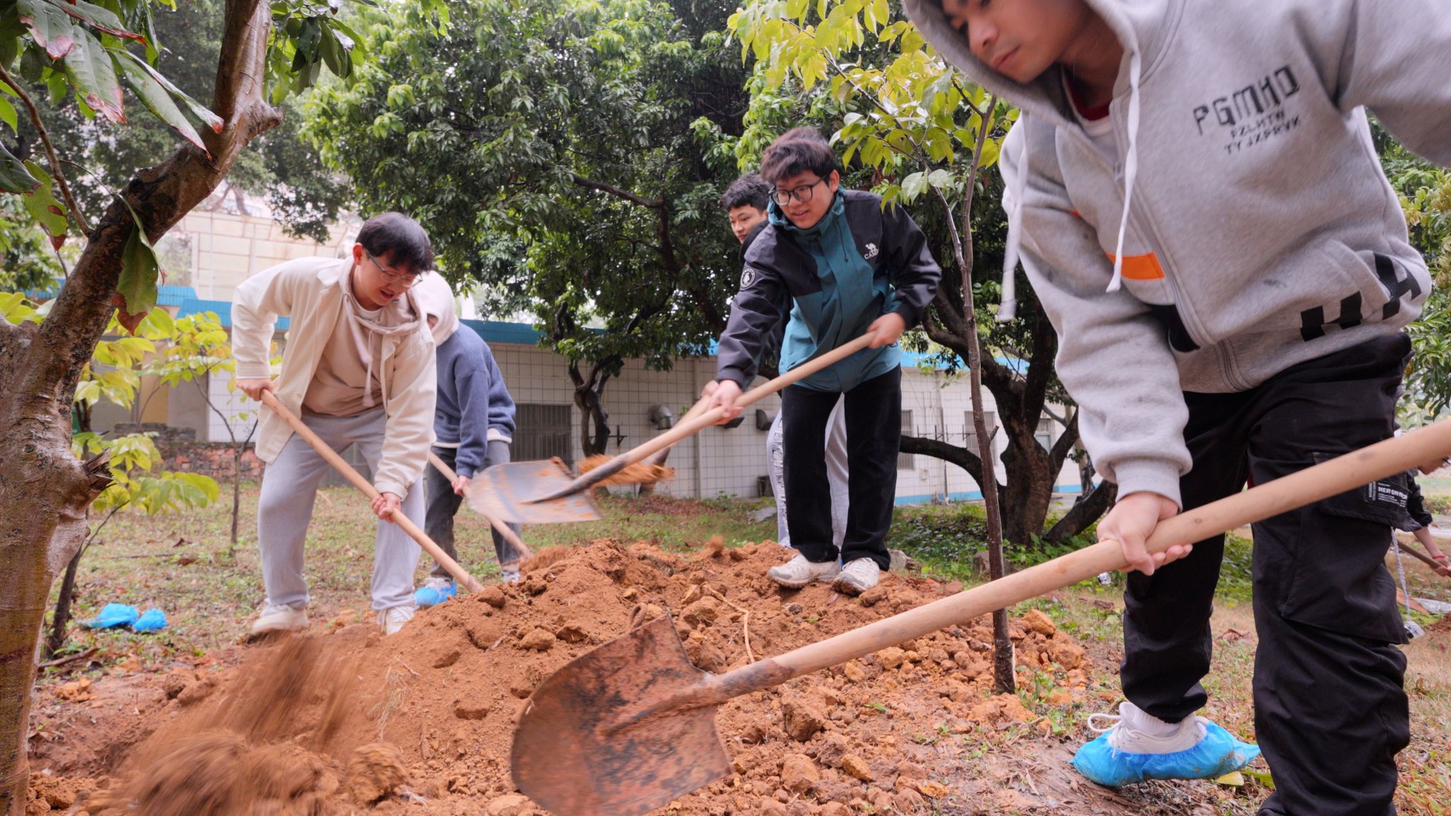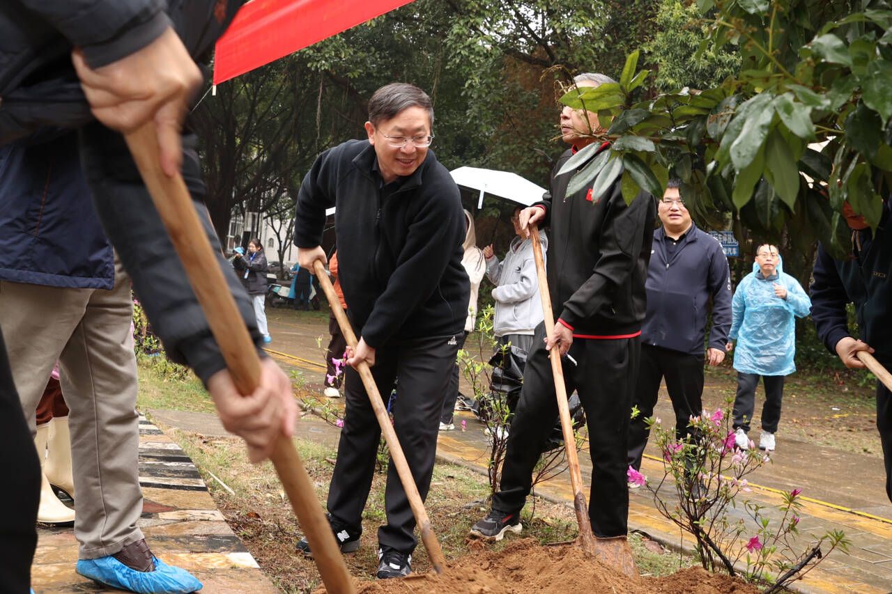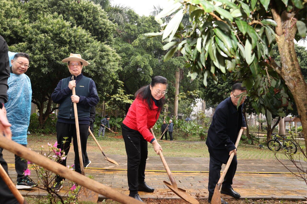 師生和校友們揮鍬挖坑、扶正樹苗、填土踏實、澆水灌溉,在相思湖畔栽種下了由校友們捐贈的荔枝樹。