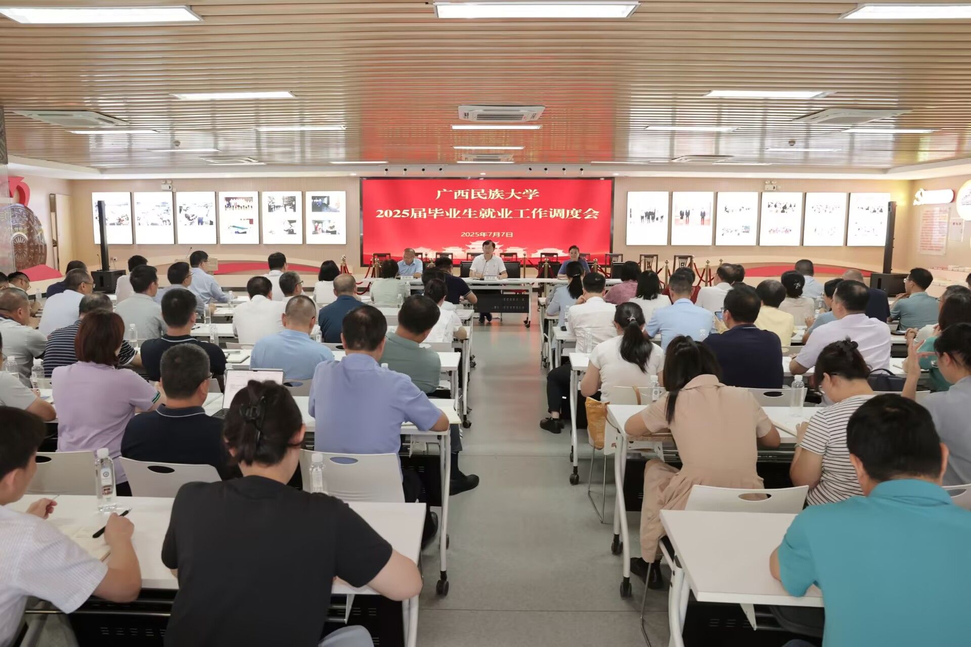 【大學生通訊社報道】7月7日下午,廣西民族大學在相思湖校區新時代“我與祖國共成長”黨團主題活動文明實踐所召開2025屆畢業生就業工作調度會。校黨委書記唐平秋,校長韋仕珍出席會議并講話,副校長姜明國主持會議。有關職能部門負責人、各學院負責畢業生就業工作分管領導、輔導員等參加會議。