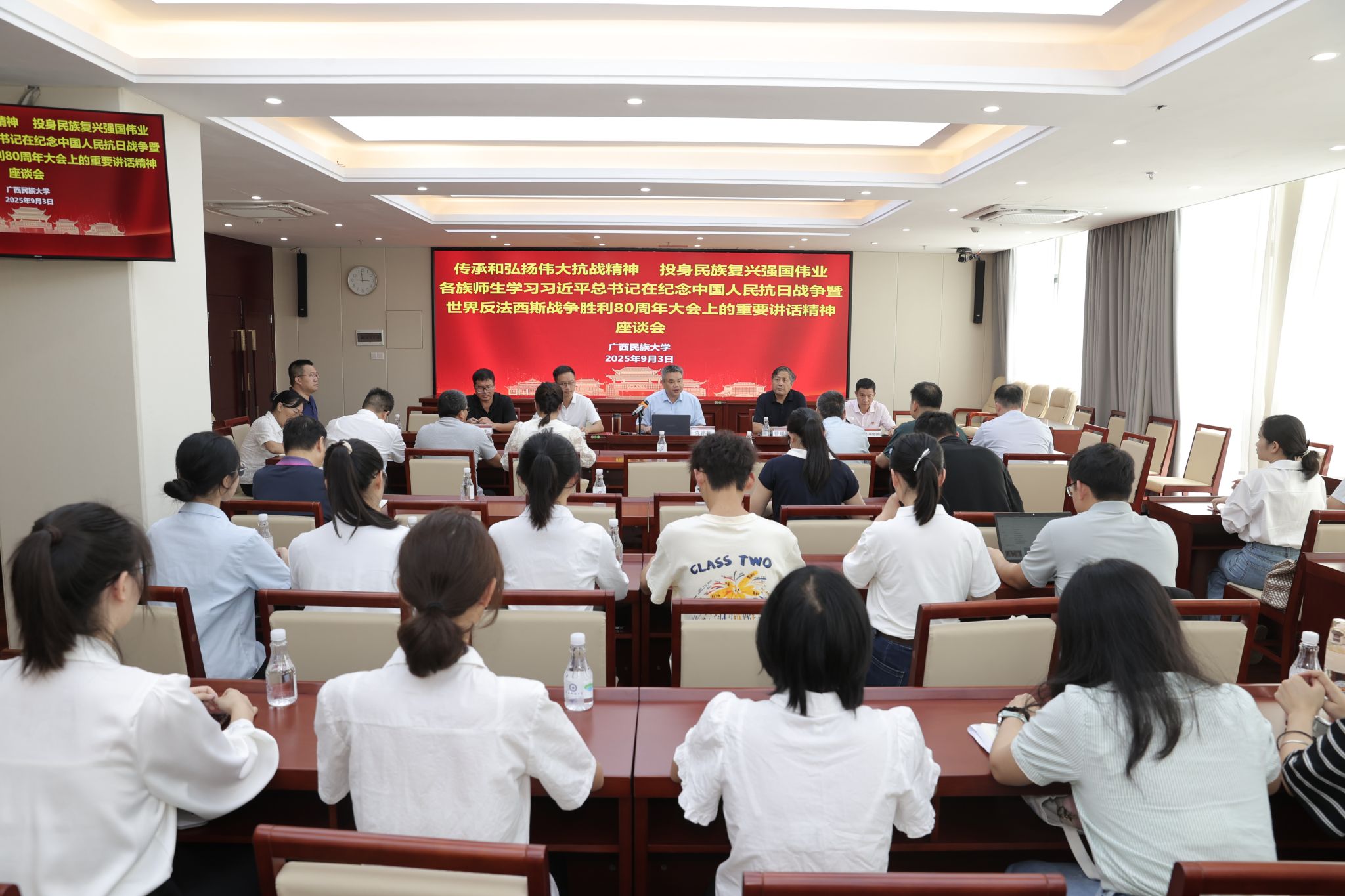 【大學生通訊社報道】9月3日至5日,廣西民族大學師生通過座談研討、主題班會等多種形式,深入學習習近平總書記在紀念中國人民抗日戰爭暨世界反法西斯戰爭勝利80周年大會上的重要講話精神。
