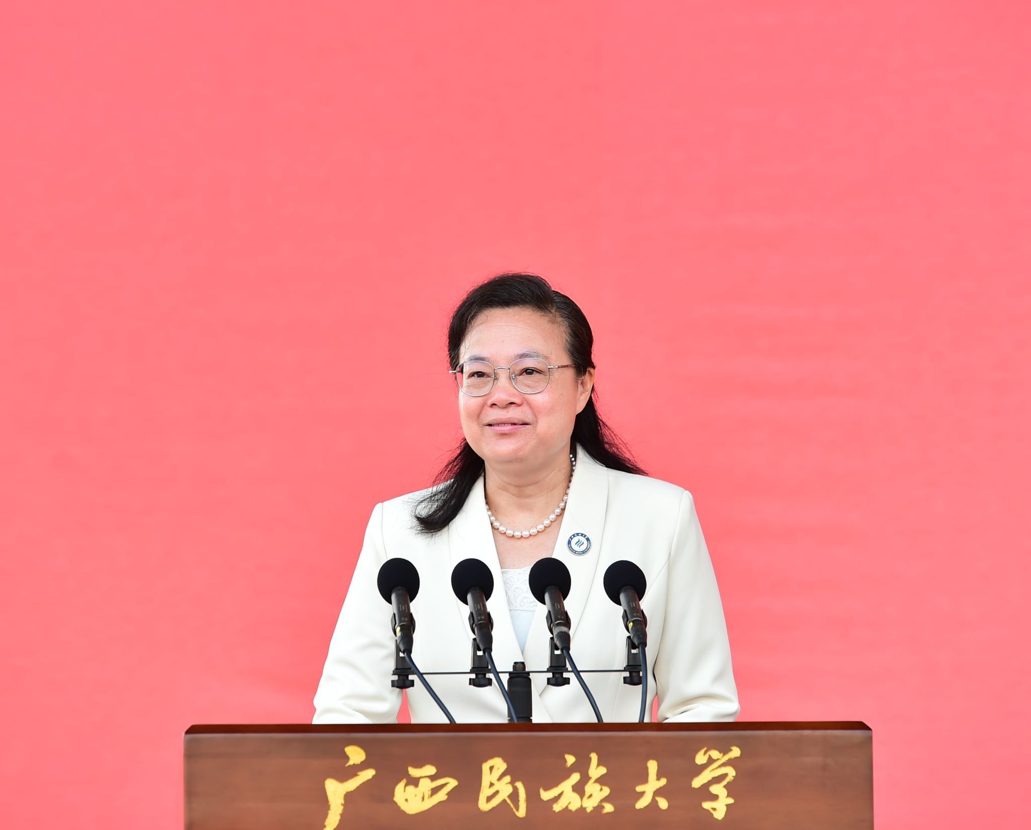 韋仕珍對2025級新生表示歡迎,并對全體教師致以節日問候。她回顧了學校73年辦學歷程中積淀的光榮使命、文學成就、育人體系、東盟視野、民族團結和創新力量,指出這些都是民大“向下扎根、向上生長”精神的生動實踐。