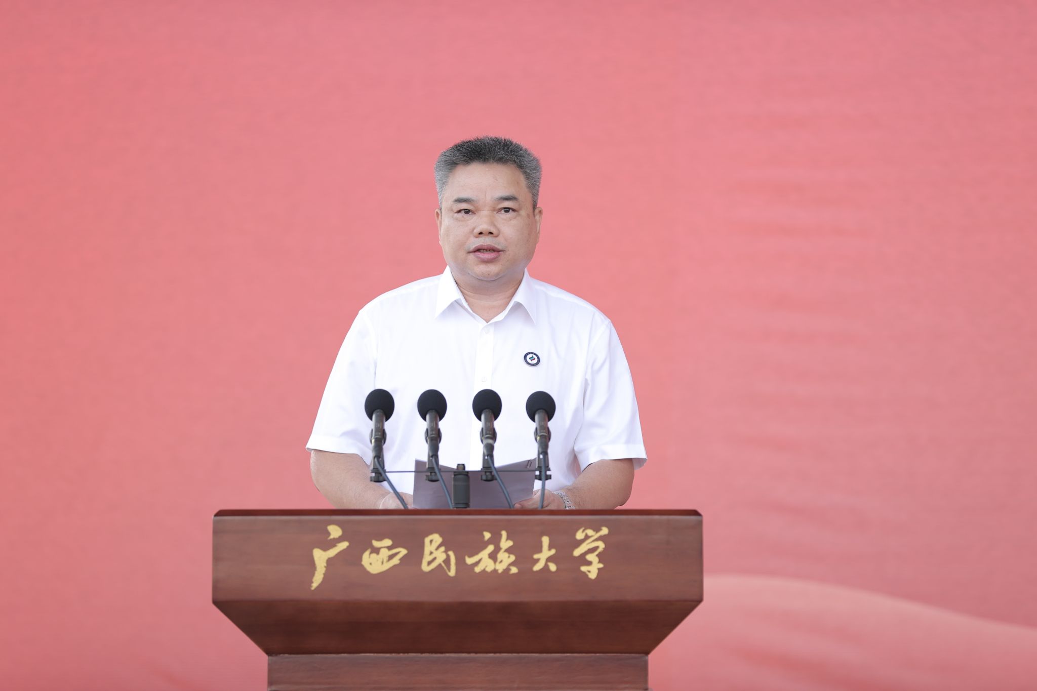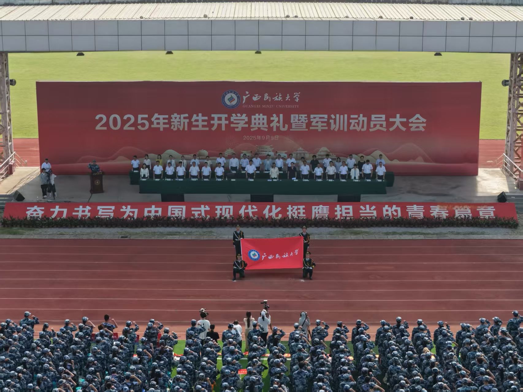 【大學生通訊社報道】9月8日,廣西民族大學2025年新生開學典禮在思源湖校區李寧田徑場、武鳴校區體育館舉行。校黨委書記唐平秋出席并為新生代表贈送校徽徽章,校長韋仕珍出席并講話,校領導陳銘彬、韋雪芳、鄧國彬、蔡高根、呂俊彪、何立榮、姜明國、高興宇出席,學校有關職能部門、各學院負責人、教師代表、輔導員、班主任及2025級全體新生參加。典禮由校黨委副書記陳銘彬主持。