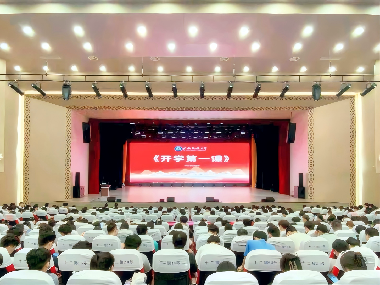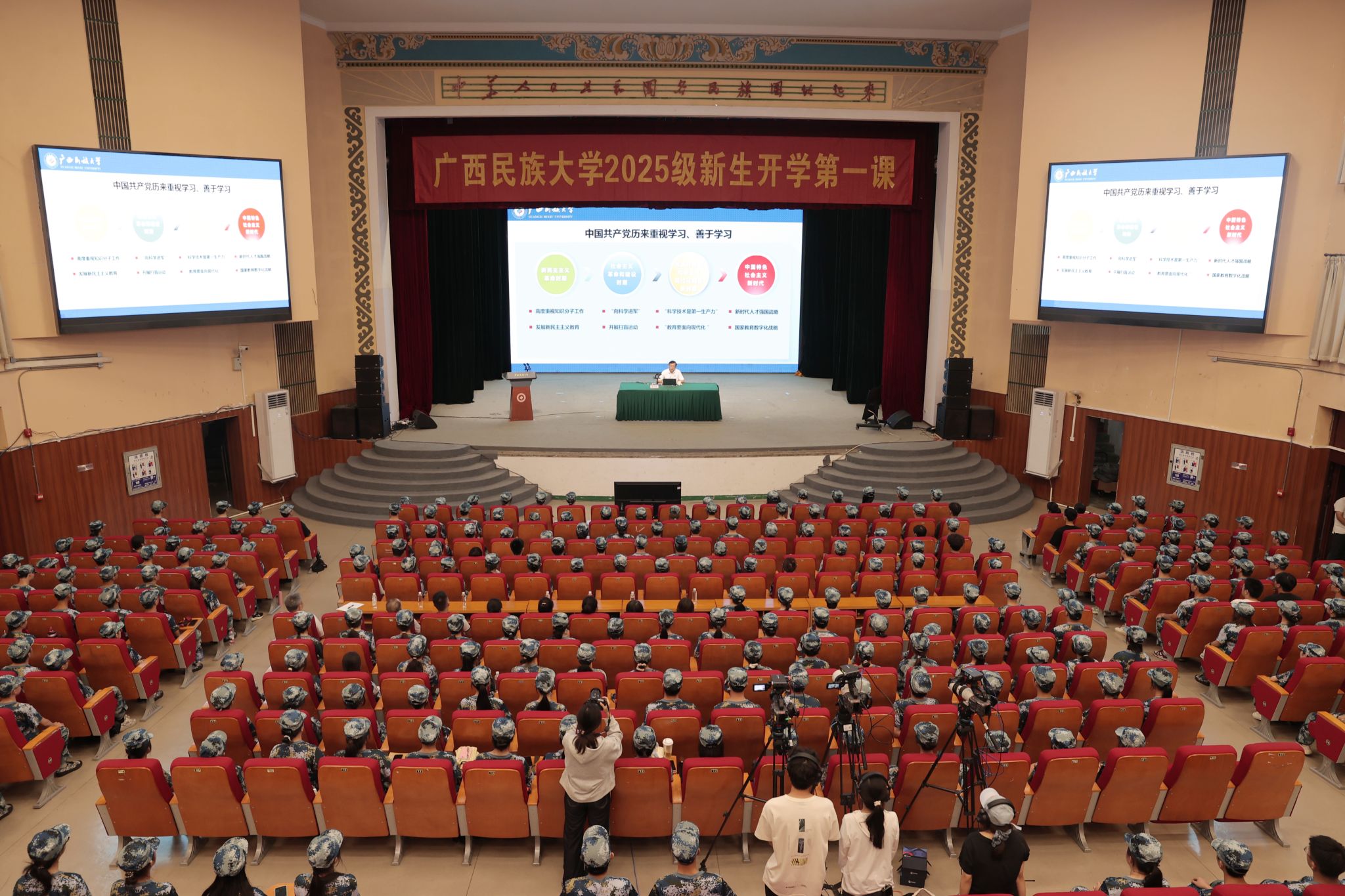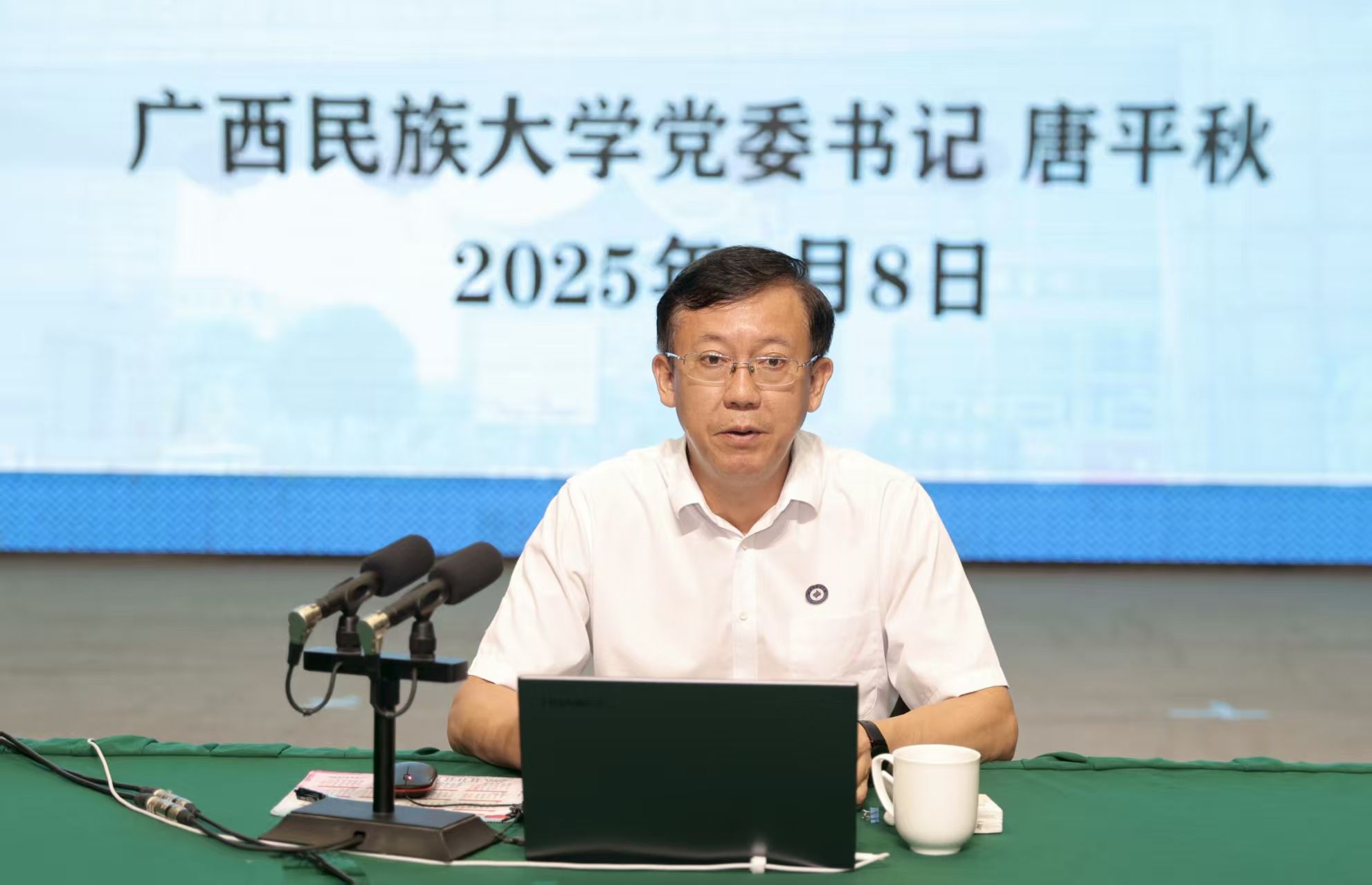 【大學生通訊社報道】9月8日晚,廣西民族大學2025級新生“開學第一課”在相思湖校區、思源湖校區、武鳴校區同步舉行。校黨委書記唐平秋圍繞“以學習為帆,在青春的征程中引領人生航向”作專題講授,2025級全體新生同上“開學第一課”。