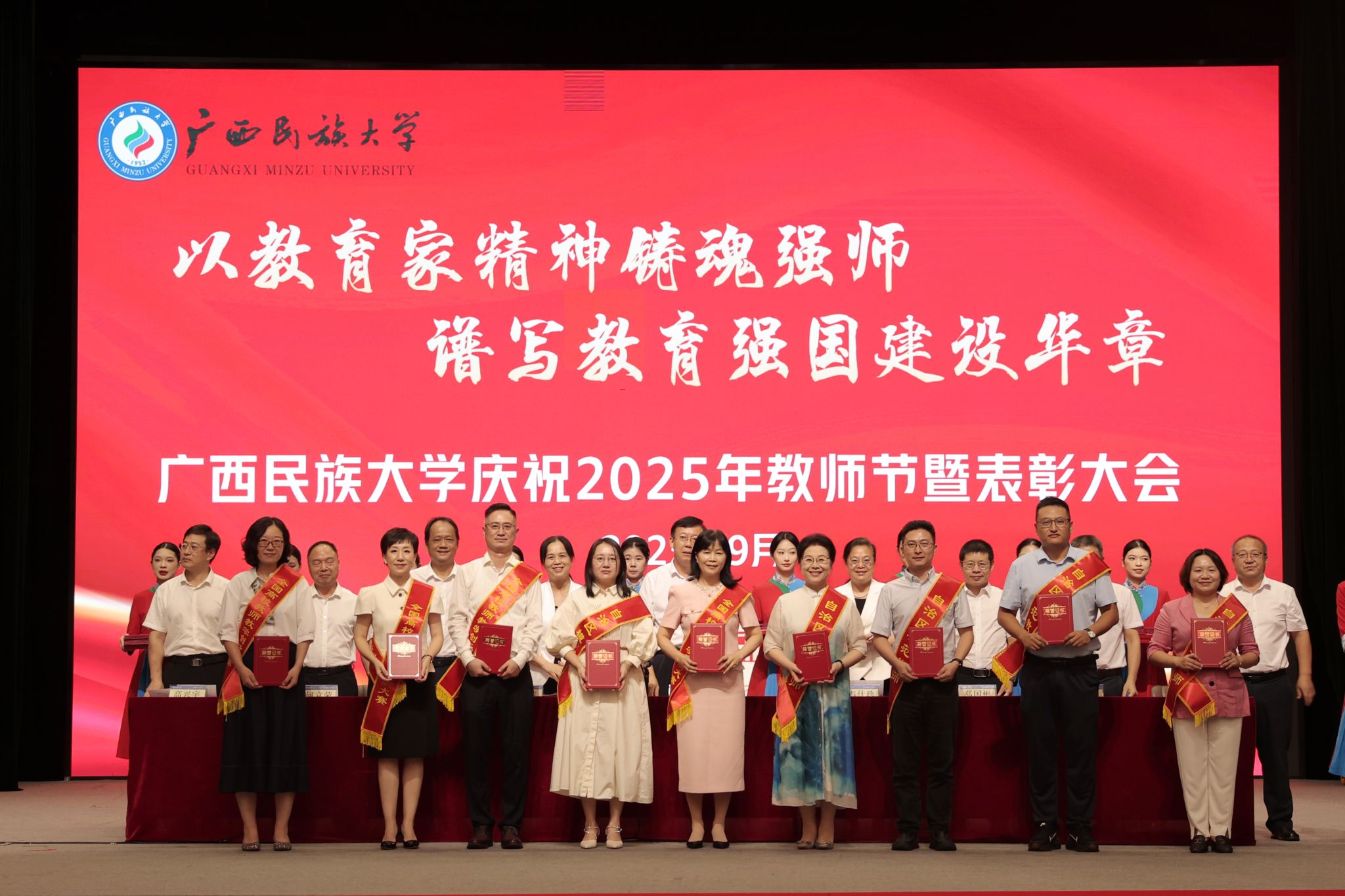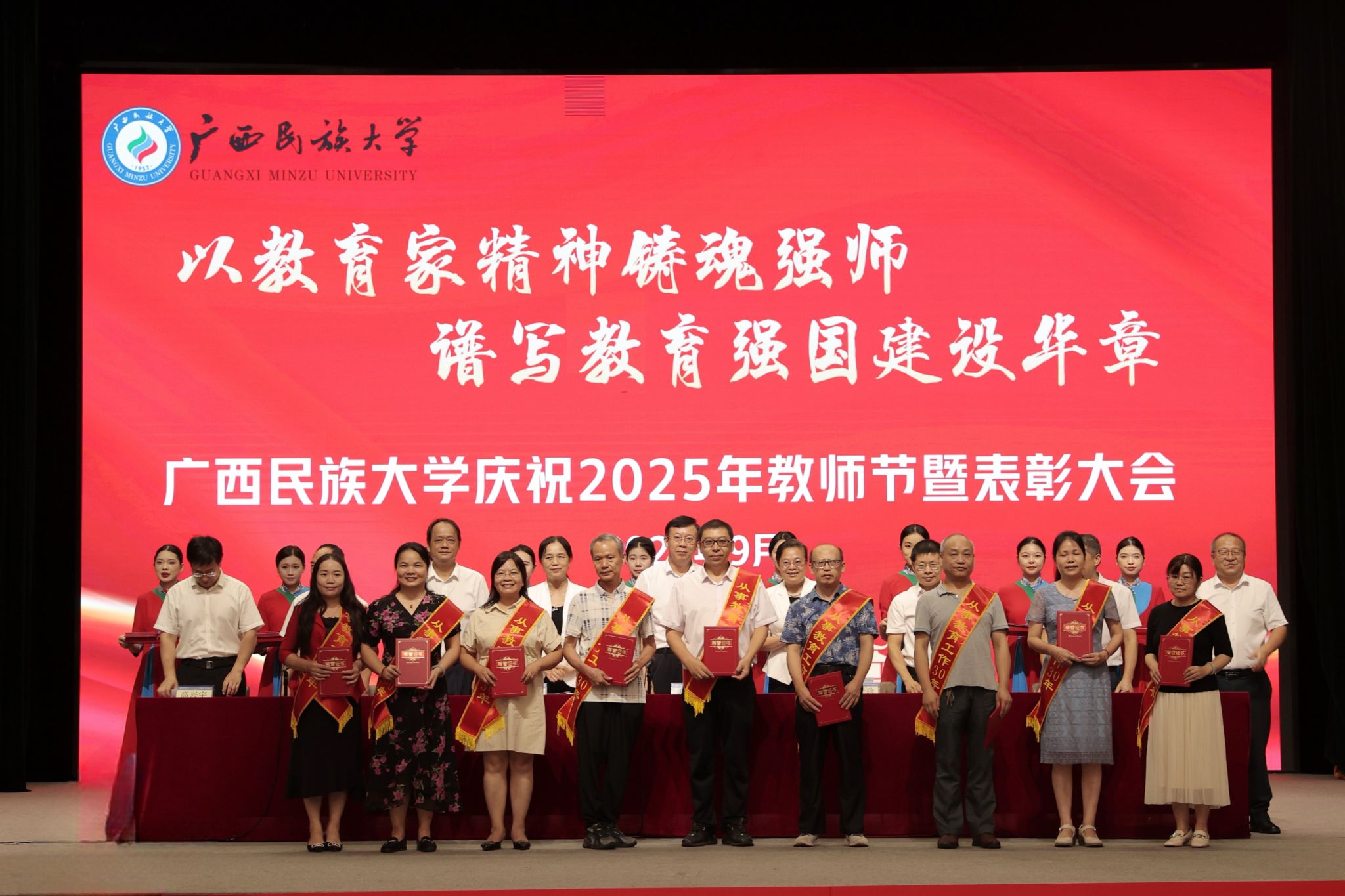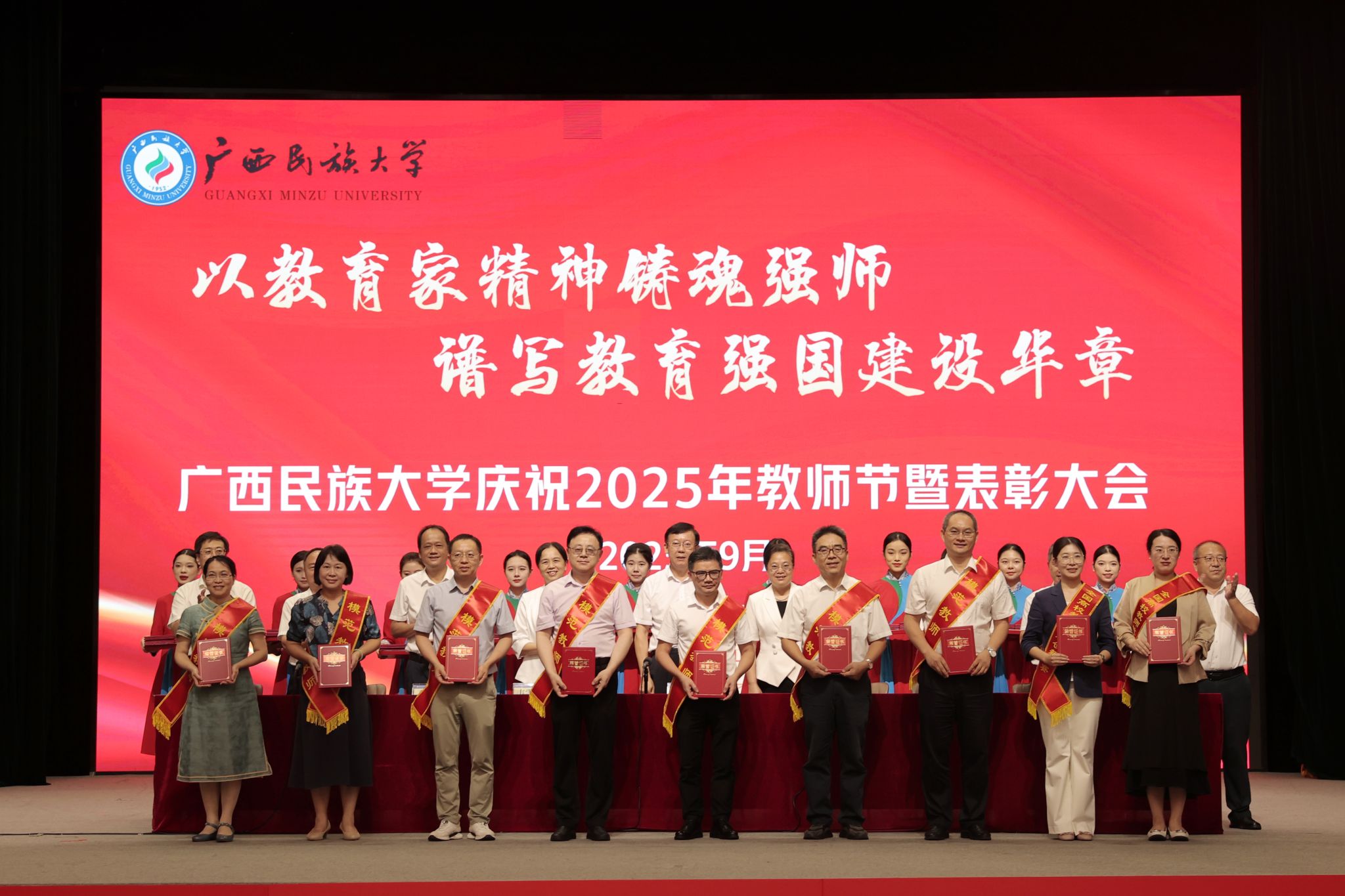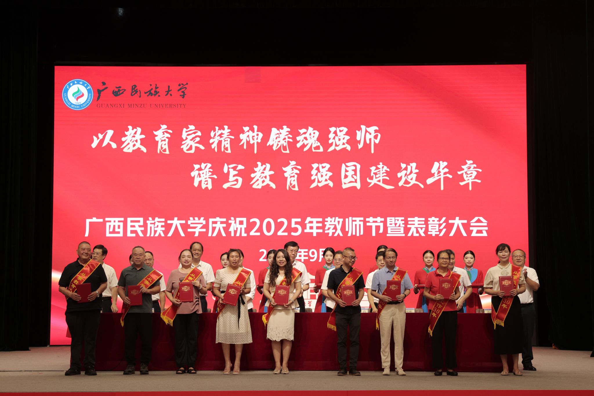 黨委書記唐平秋為2024年全國“模范教師”雷湘竹教授頒發(fā)榮譽證書,黨委副書記、校長韋仕珍為國家級青年人才劉金林教授頒發(fā)榮譽證書,校領導為2025年全國高校教師教學創(chuàng)新大賽獲獎者、2024年自治區(qū)“模范教師”、2024年廣西“最美高校輔導員”“高校輔導員年度人物”、2025年“自治區(qū)優(yōu)秀退役軍人”,以及學校2023—2025年“模范教師”“優(yōu)秀教師”“優(yōu)秀教育工作者”“從事教育工作30年”獲獎者代表頒發(fā)證書。
