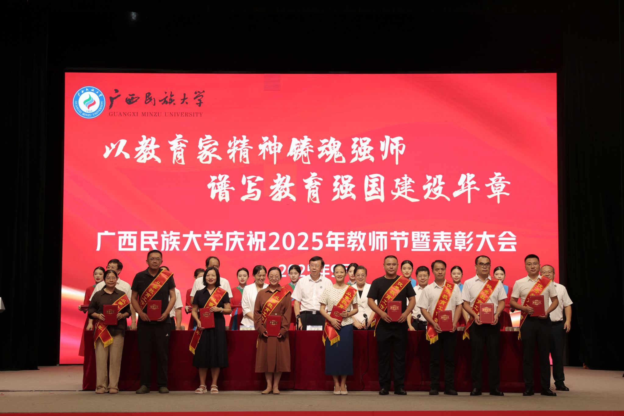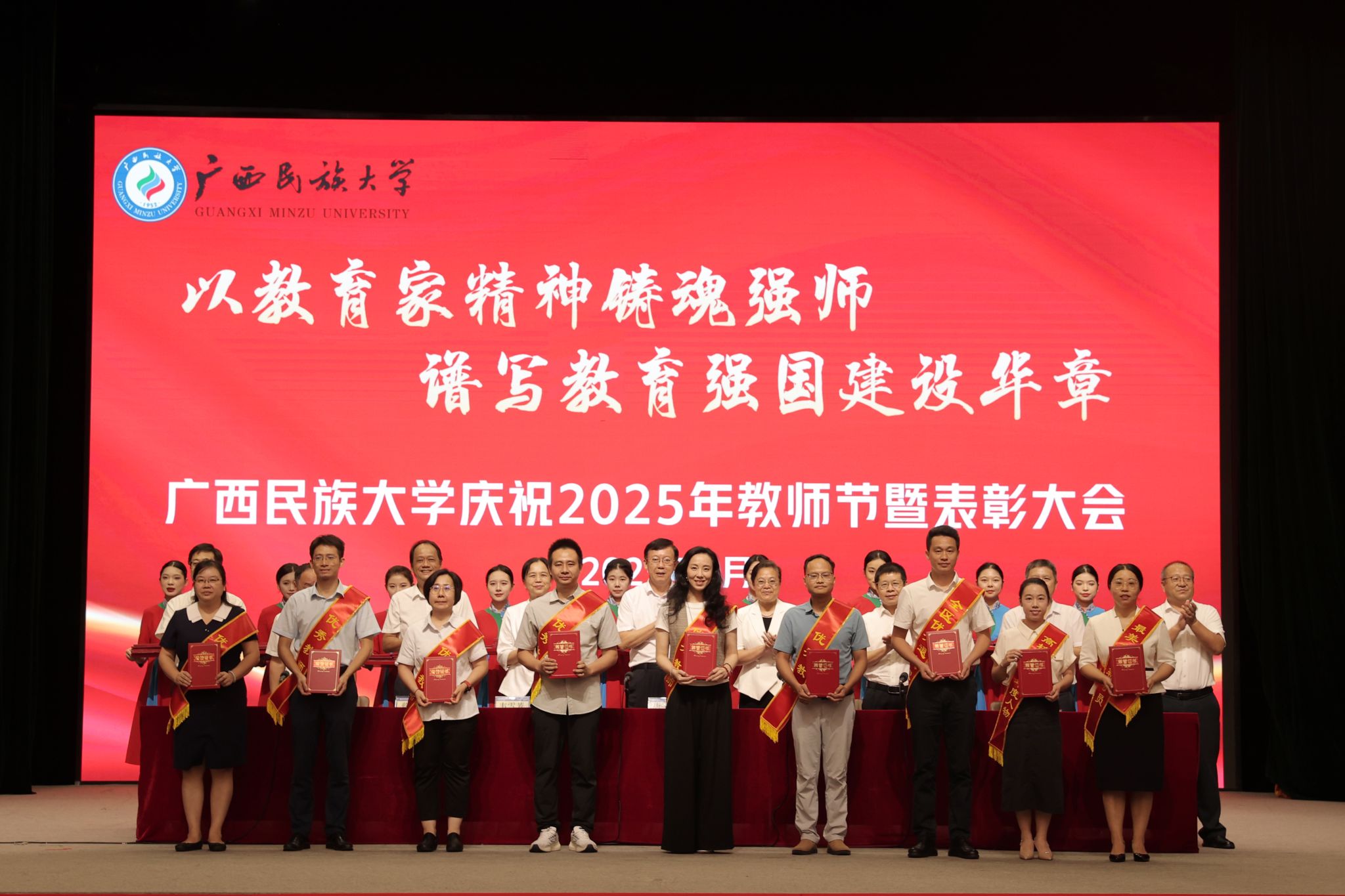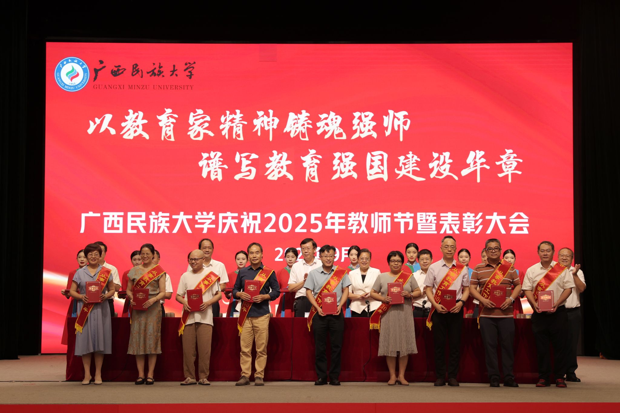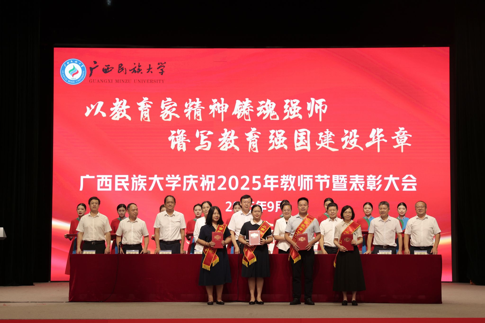 黨委書記唐平秋為2024年全國“模范教師”雷湘竹教授頒發(fā)榮譽證書,黨委副書記、校長韋仕珍為國家級青年人才劉金林教授頒發(fā)榮譽證書,校領導為2025年全國高校教師教學創(chuàng)新大賽獲獎者、2024年自治區(qū)“模范教師”、2024年廣西“最美高校輔導員”“高校輔導員年度人物”、2025年“自治區(qū)優(yōu)秀退役軍人”,以及學校2023—2025年“模范教師”“優(yōu)秀教師”“優(yōu)秀教育工作者”“從事教育工作30年”獲獎者代表頒發(fā)證書。