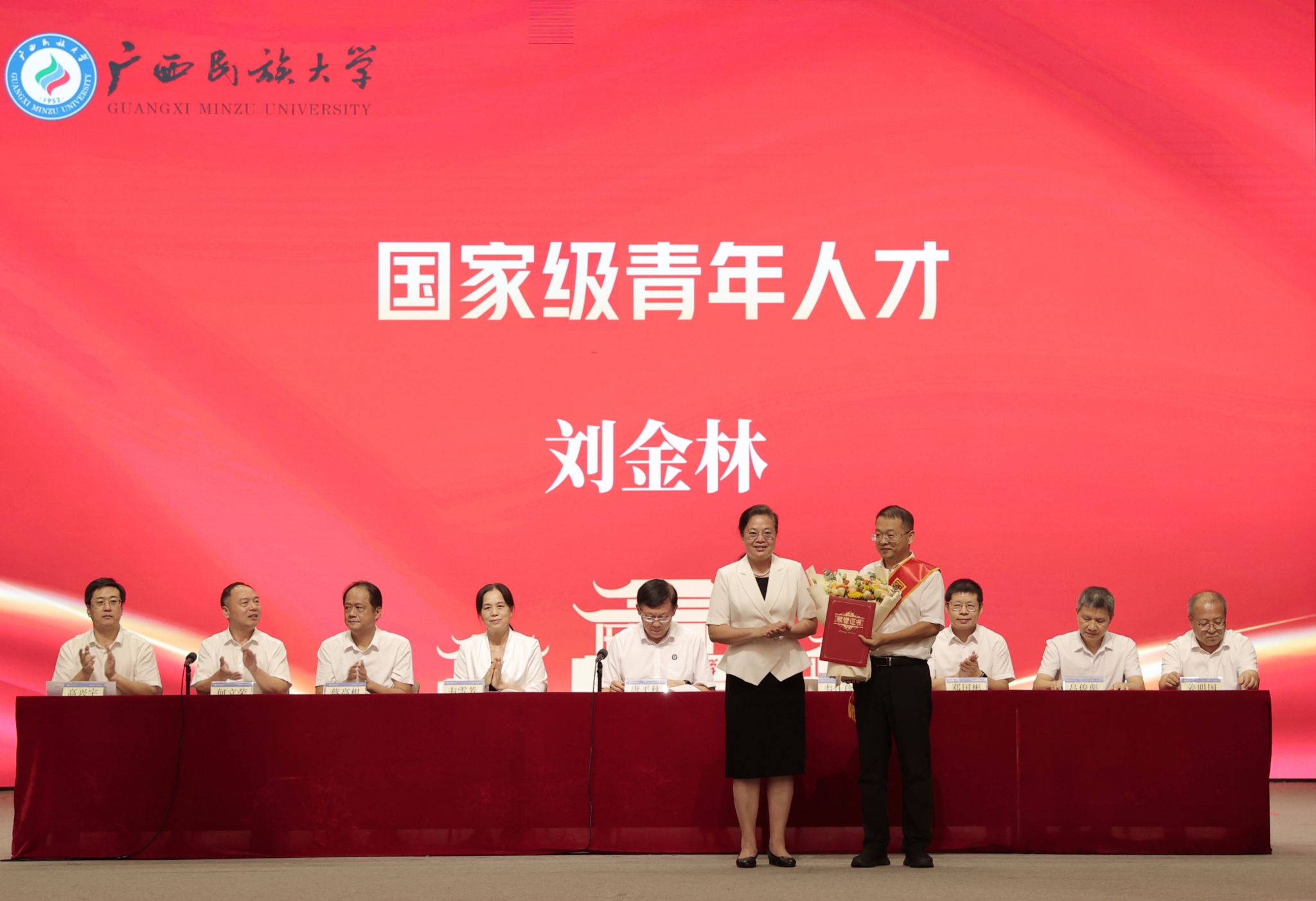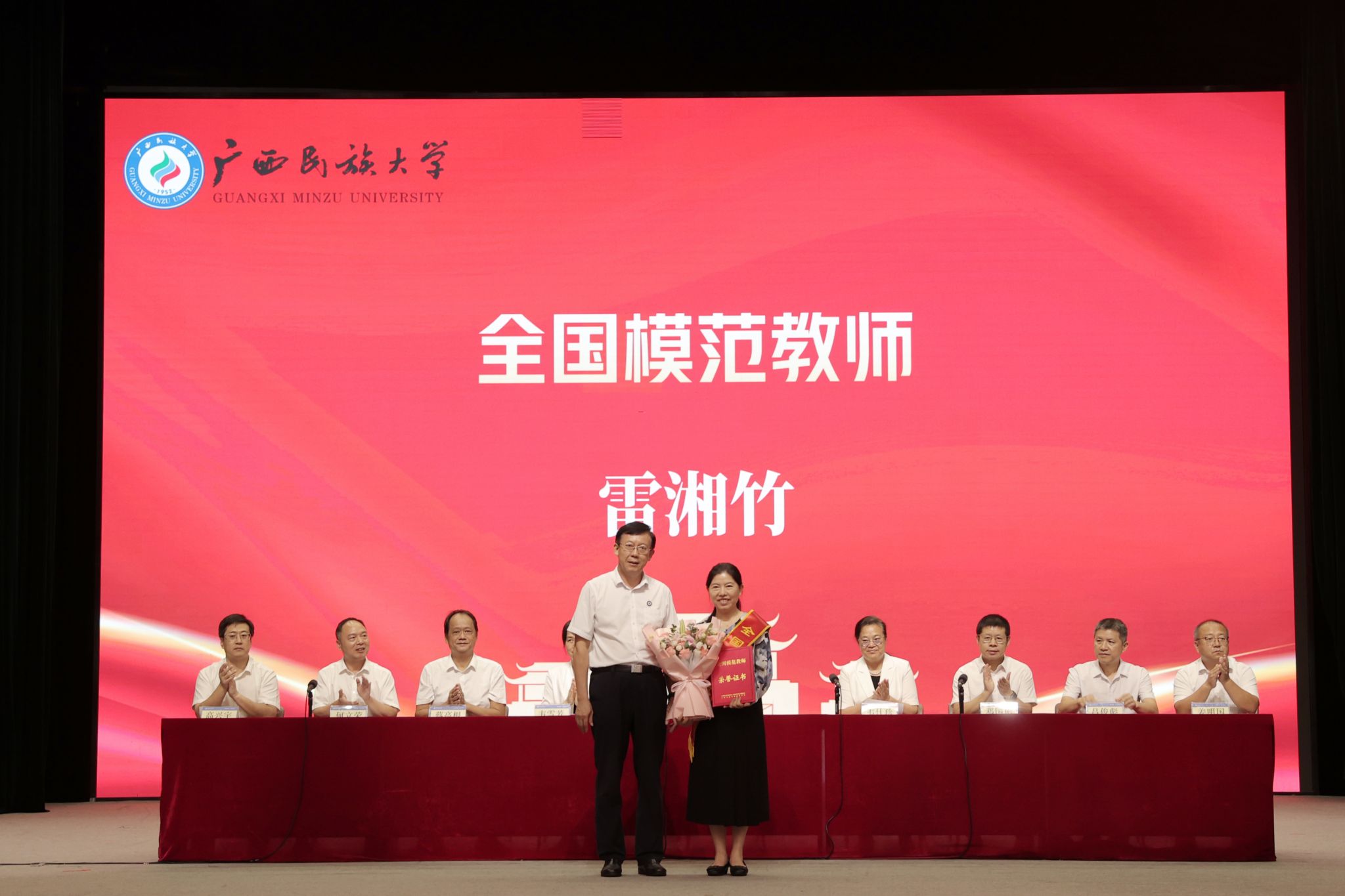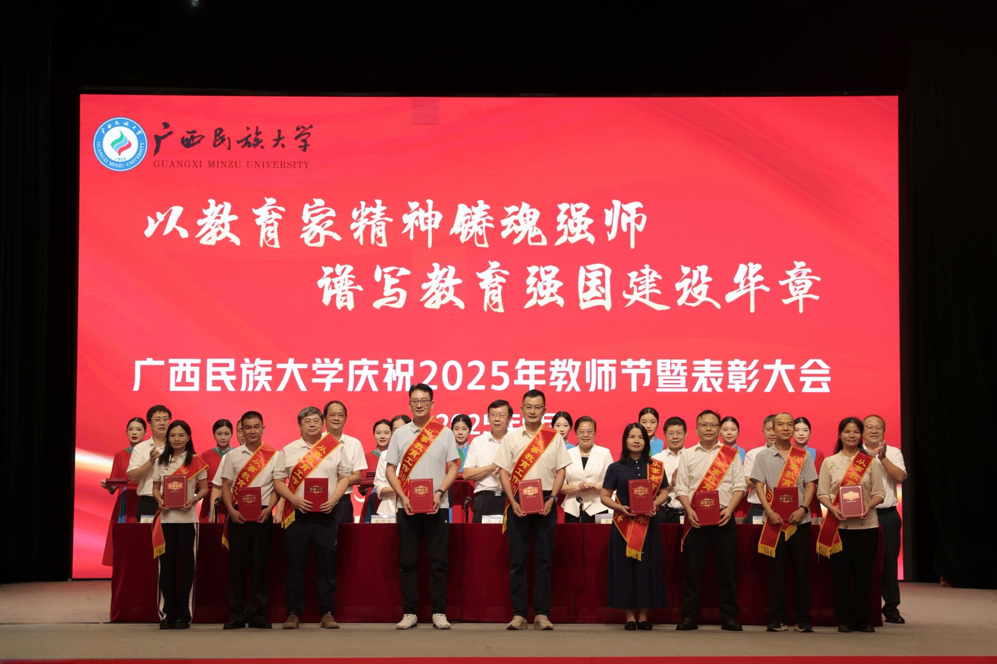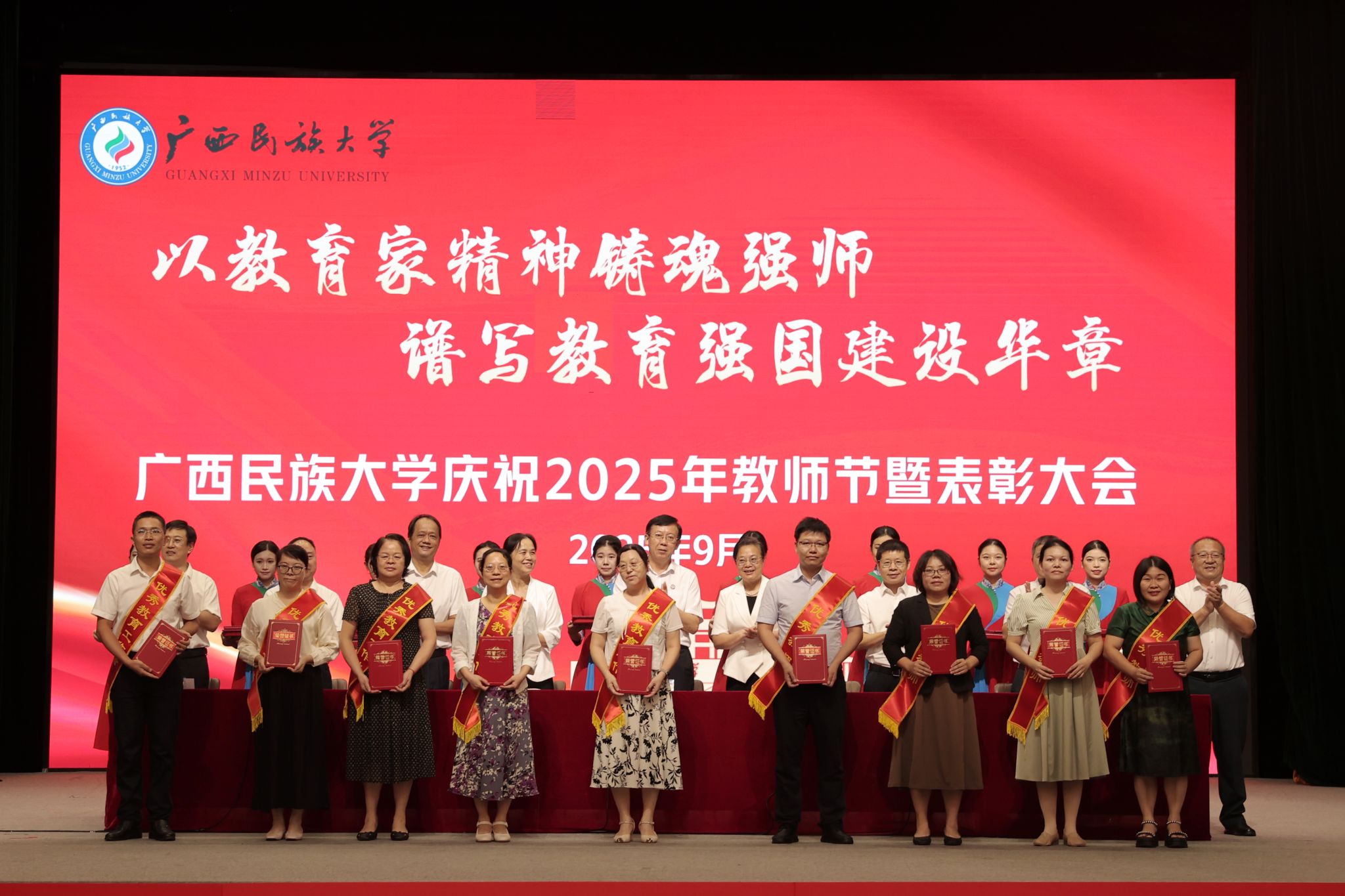黨委書記唐平秋為2024年全國“模范教師”雷湘竹教授頒發(fā)榮譽證書,黨委副書記、校長韋仕珍為國家級青年人才劉金林教授頒發(fā)榮譽證書,校領導為2025年全國高校教師教學創(chuàng)新大賽獲獎者、2024年自治區(qū)“模范教師”、2024年廣西“最美高校輔導員”“高校輔導員年度人物”、2025年“自治區(qū)優(yōu)秀退役軍人”,以及學校2023—2025年“模范教師”“優(yōu)秀教師”“優(yōu)秀教育工作者”“從事教育工作30年”獲獎者代表頒發(fā)證書。