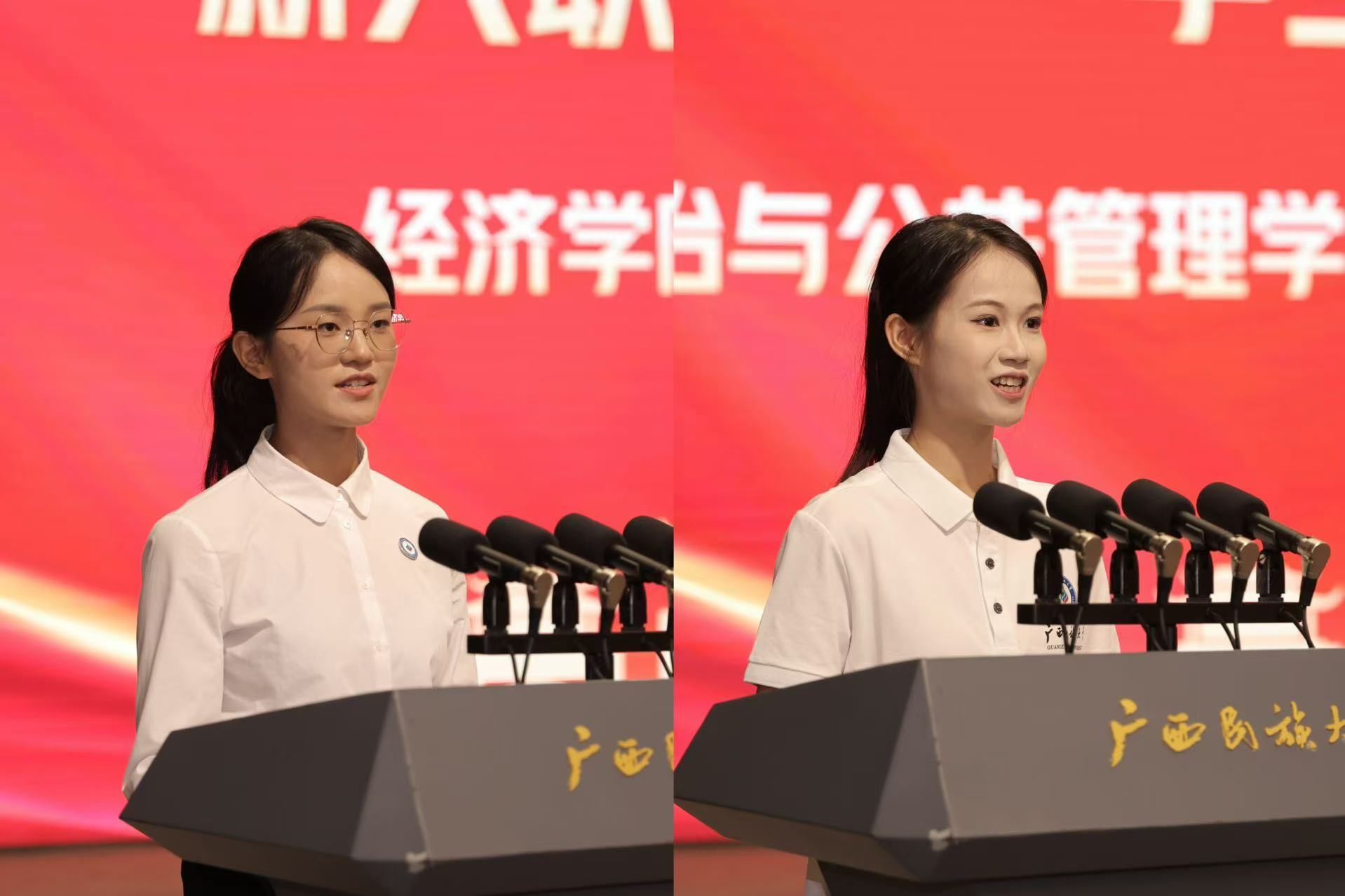 新入職教師代表、經(jīng)濟學院趙攀婷老師和政治與公共管理學院2022級本科生蒙鑫美分別發(fā)言