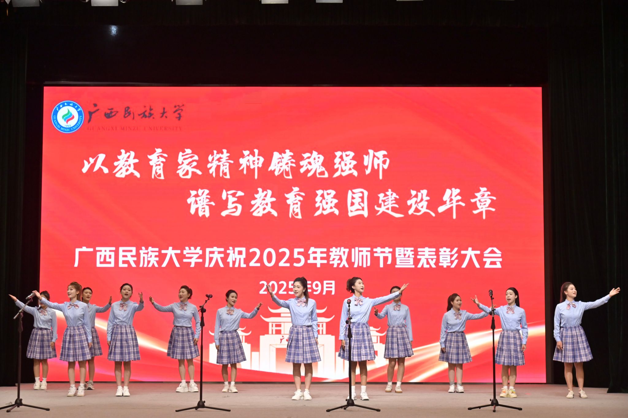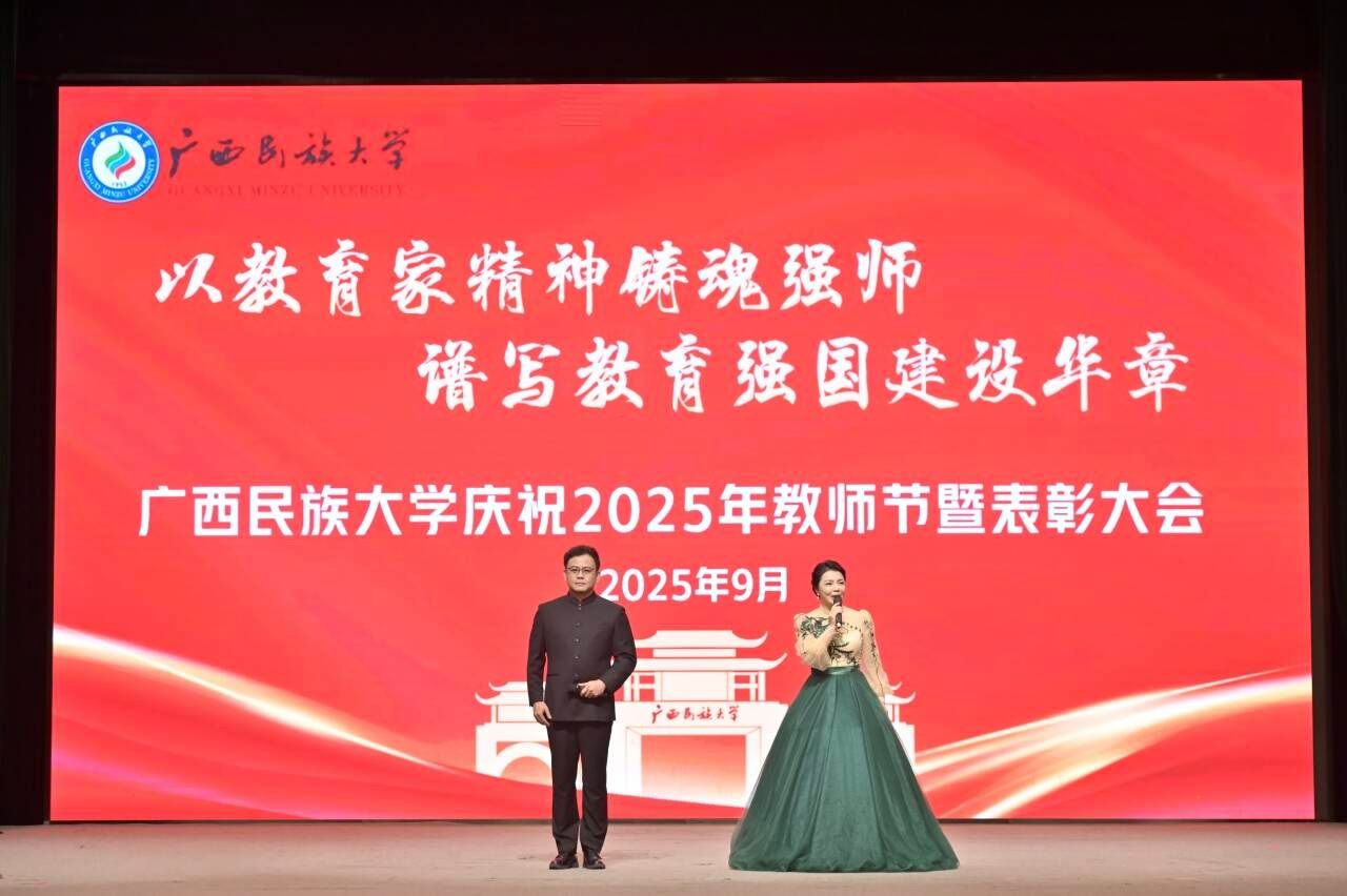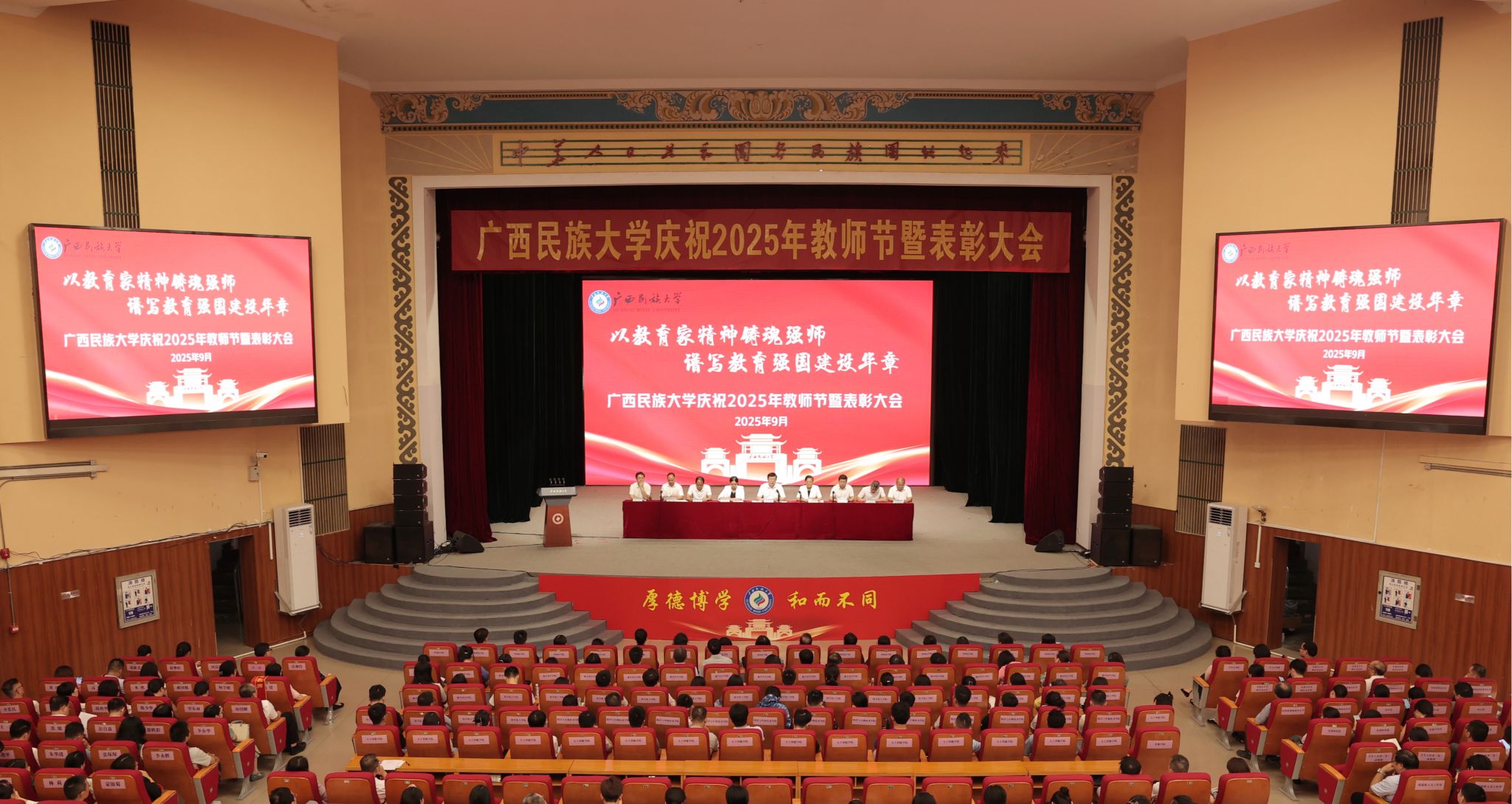 【大學生通訊社報道】9月9日下午,廣西民族大學慶祝2025年教師節(jié)暨表彰大會在相思湖校區(qū)大禮堂召開。校黨委書記唐平秋,校長韋仕珍,校領導韋雪芳、鄧國彬、蔡高根、呂俊彪、何立榮、姜明國、高興宇出席大會,教職工及學生代表參會。副校長何立榮主持大會。