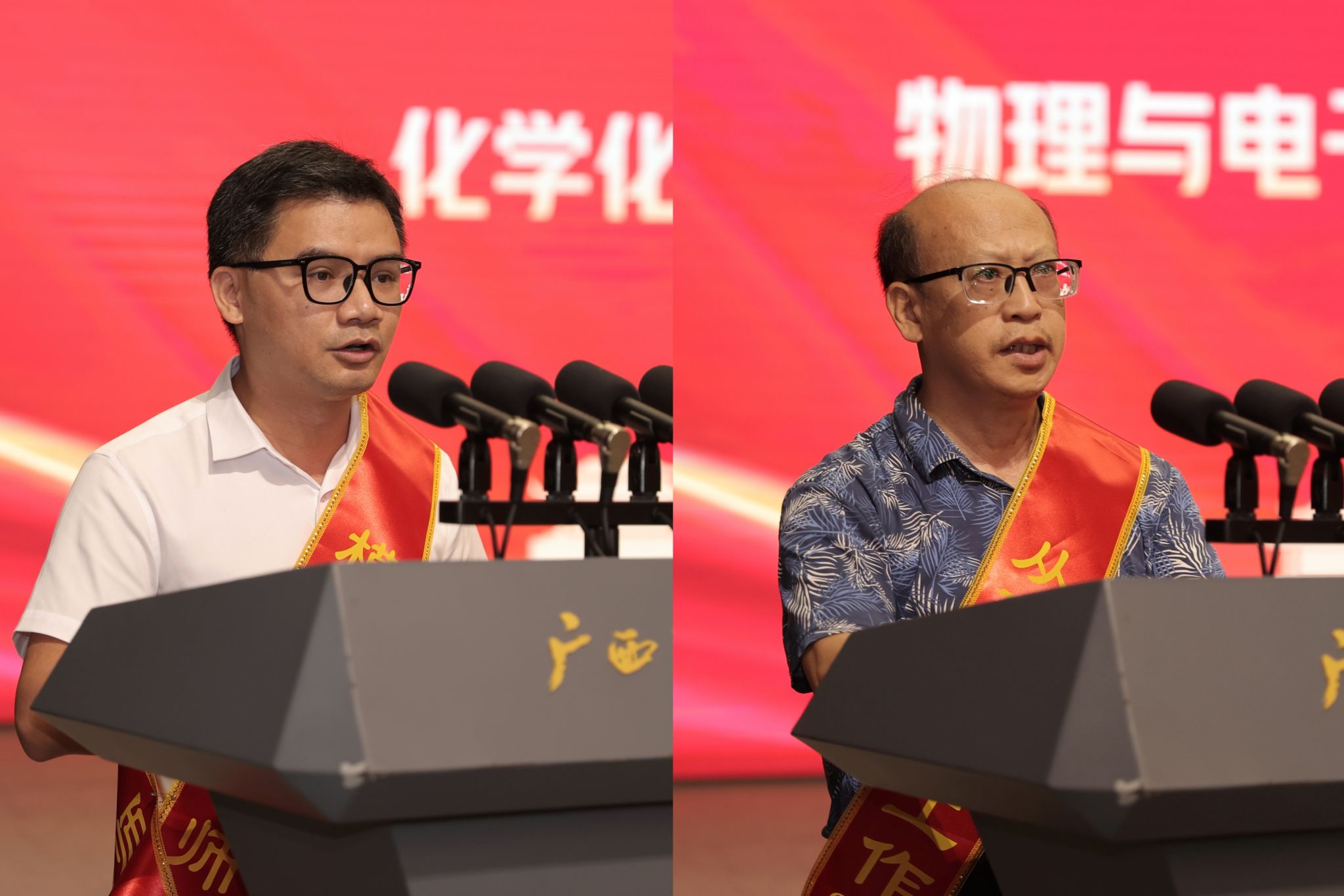 模范教師代表、化學化工學院關一富教授和“從事教育工作30年”教師代表,物理與電子信息學院何良明教授發(fā)言