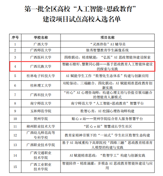 近日,廣西壯族自治區(qū)教育廳公布第一批全區(qū)高校“人工智能+思政教育”建設(shè)項目試點高校名單,廣西民族大學(xué)成功入選,成為首批15所試點高校之一。