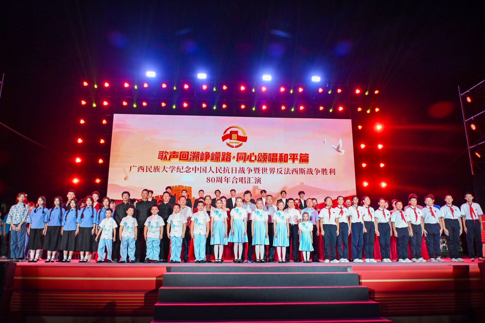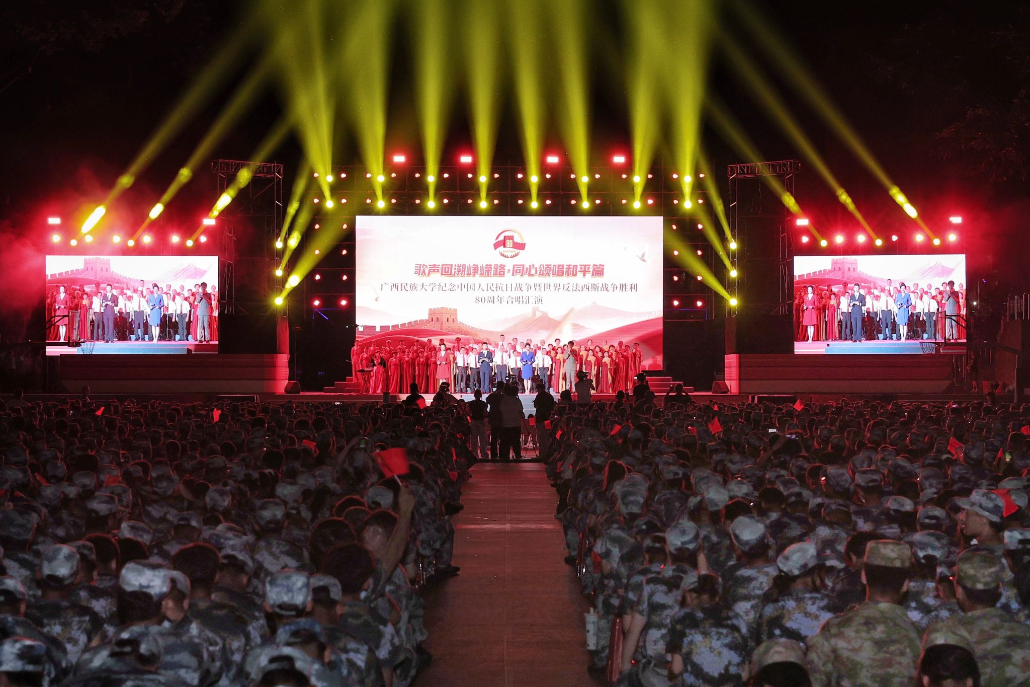 9月18日晚,廣西民族大學(xué)在相思湖校區(qū)燈光球場(chǎng)舉辦“歌聲回溯崢嶸路·同心頌唱和平篇”——紀(jì)念中國(guó)人民抗日戰(zhàn)爭(zhēng)暨世界反法西斯戰(zhàn)爭(zhēng)勝利80周年合唱匯演。校黨委書記唐平秋,校領(lǐng)導(dǎo)陳銘彬、韋雪芳、鄧國(guó)彬、呂俊彪、何立榮等出席活動(dòng)。各參演隊(duì)伍,有關(guān)職能部門與學(xué)院代表,相思湖校區(qū)2025級(jí)本科新生、南寧市相思湖學(xué)校民大校區(qū)初中部、小學(xué)部共同參加活動(dòng)。