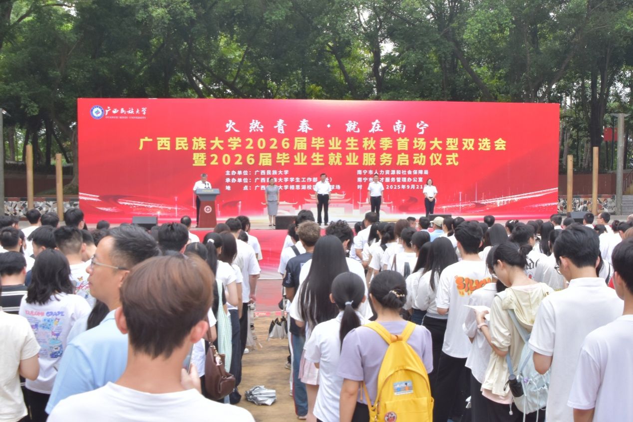 【大學生通訊社報道】9月21日上午,廣西民族大學舉行2026屆畢業生秋季首場大型雙選會暨2026屆畢業生就業服務啟動儀式。校黨委書記唐平秋出席儀式并講話,校長韋仕珍出席活動,校黨委副書記陳銘彬主持儀式。南寧市人力資源和社會保障局副局長陸多迎、各學院負責同志、教師及學生代表參加。