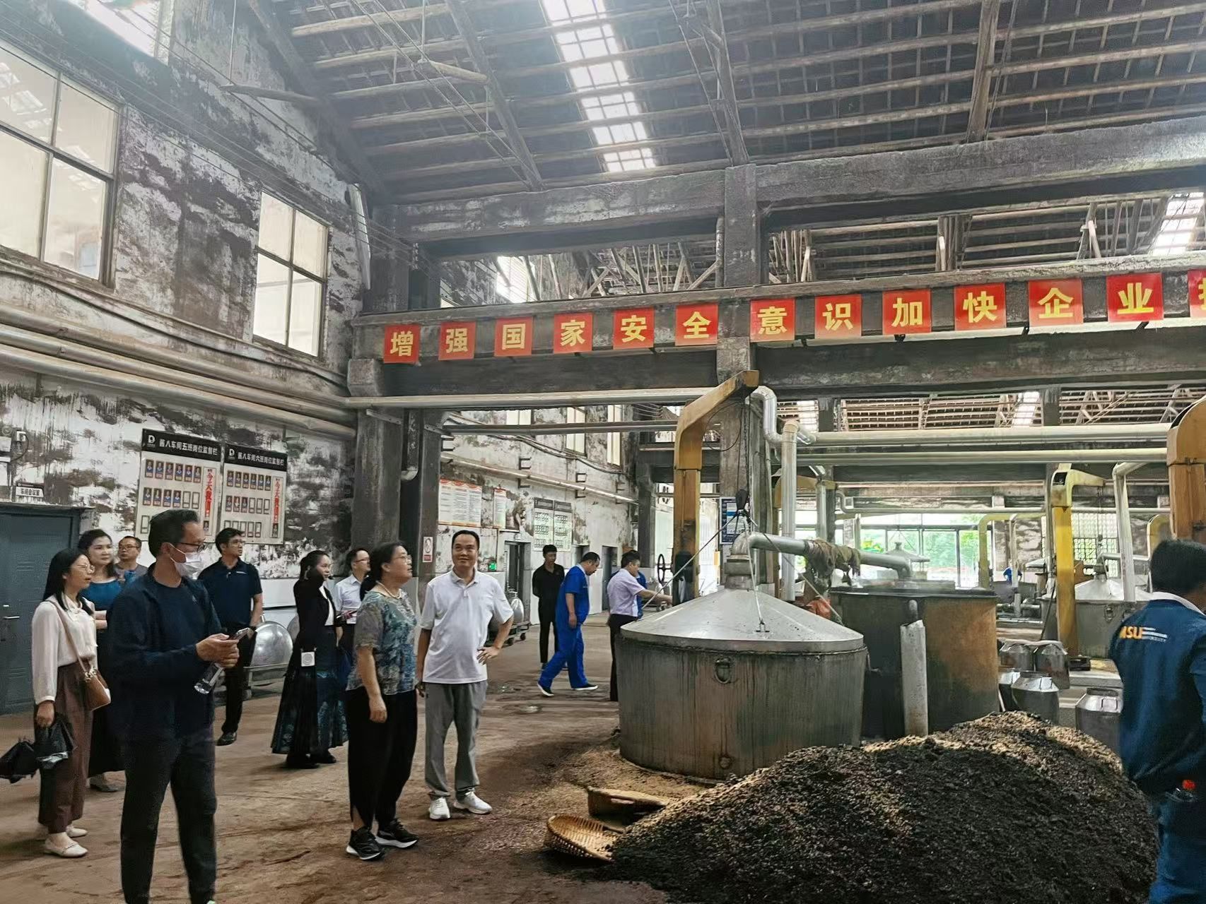 在丹泉酒業總經理潘正福的陪同下,韋仕珍一行實地參觀丹泉集團工業園區,深入生態釀酒車間、制曲車間、酒文化館及洞天酒海洞藏基地等區域。調研過程中,潘正福詳細介紹了丹泉酒業的發展歷程、產業布局、核心技術優勢、品牌建設成果及未來戰略規劃。
