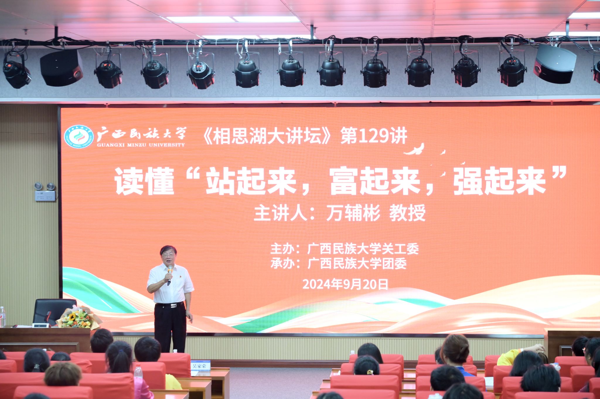 【大學(xué)生通訊社報(bào)道】9月20日下午,“相思湖大講壇”第129期——“讀懂‘站起來,富起來,強(qiáng)起來’”主題講座在相思湖校區(qū)圖書館13樓學(xué)術(shù)報(bào)告廳舉行。講座由學(xué)校關(guān)工委副主任萬輔彬教授主講。學(xué)校關(guān)工委、校團(tuán)委、廣西學(xué)聯(lián)代表及各學(xué)院師生代表參加講座。