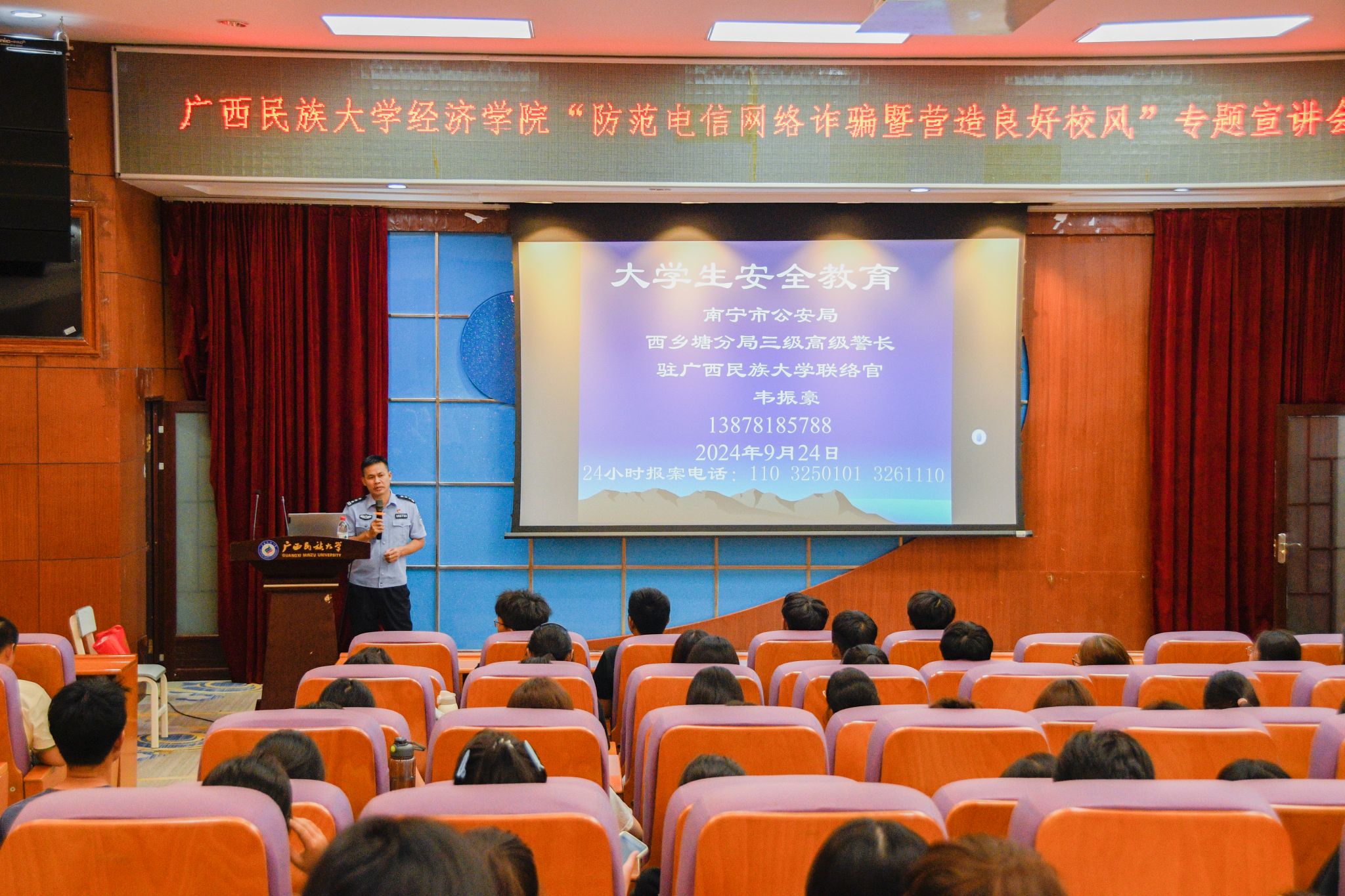 【大學生通訊社報道】9月24日,廣西民族大學“防范電信網(wǎng)絡(luò)詐騙暨營造良好校風”專題宣講會在思源湖校區(qū)至善樓報告廳舉行,經(jīng)濟學院各班學生代表參加。