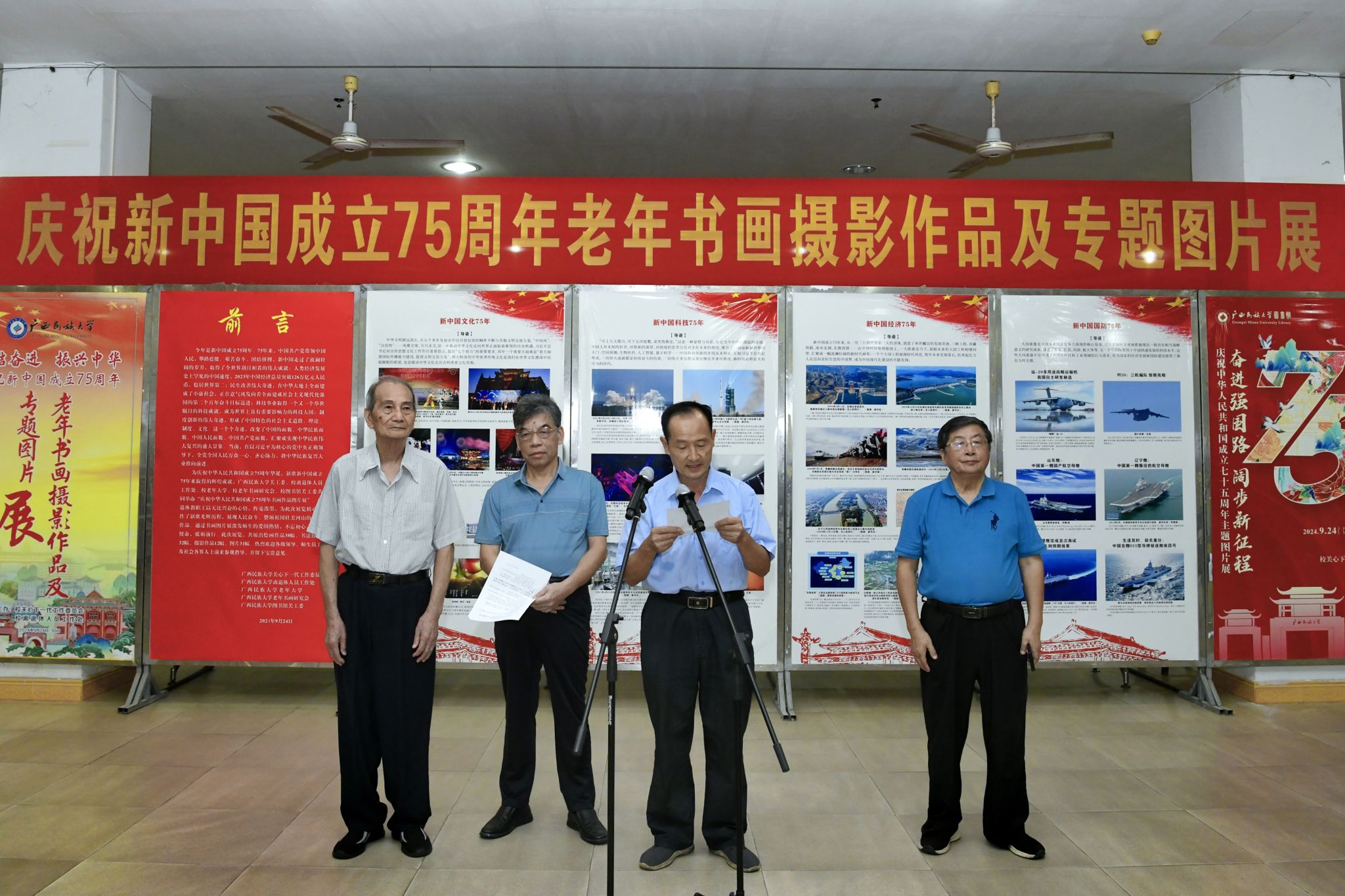 【大學生通訊社報道】9月24日,慶祝新中國成立75周年老年書畫攝影作品及專題圖片展開展儀式在老年活動中心大廳舉行。廣西民族大學原副校長李尚平,學校關工委副主任朱耀樞、萬輔彬,各學院分管關工委工作領導、師生代表、“五老”代表等參加開展儀式。儀式由學校關工委副主任楊再延主持。