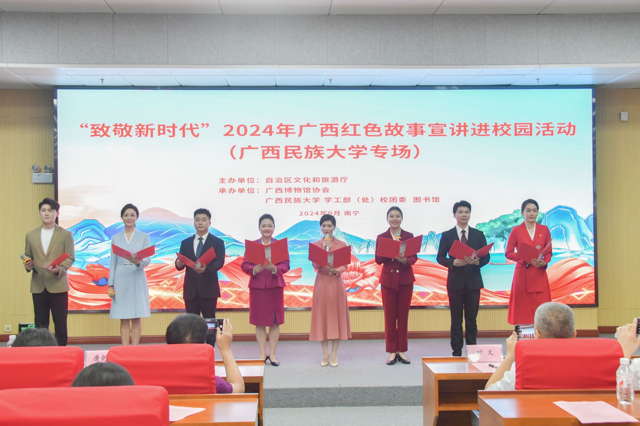 活動(dòng)中,師生們共同觀看了廣西紅色旅游宣傳片,文旅廳革命文物處負(fù)責(zé)人為學(xué)生代表贈(zèng)送《廣西紅色文化旅游圖集》。“我們向全區(qū)同行倡議,做紅色基因的堅(jiān)定傳承者……在紅色旅游講解員的光榮崗位上,用奮斗書寫我們的多彩年華,讓共和國的紅色更加鮮艷。”活動(dòng)在講解員們的宣讀中結(jié)束。