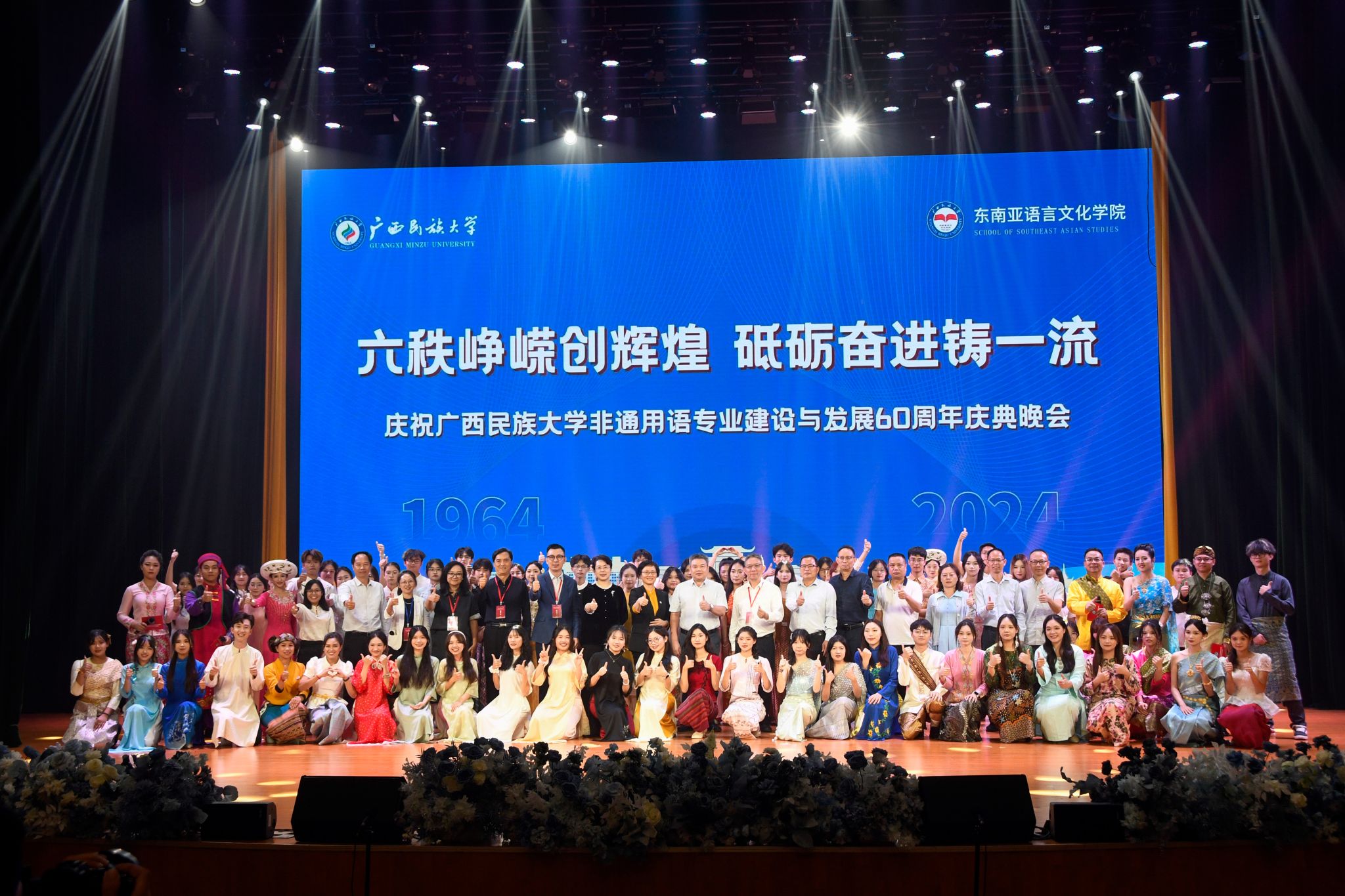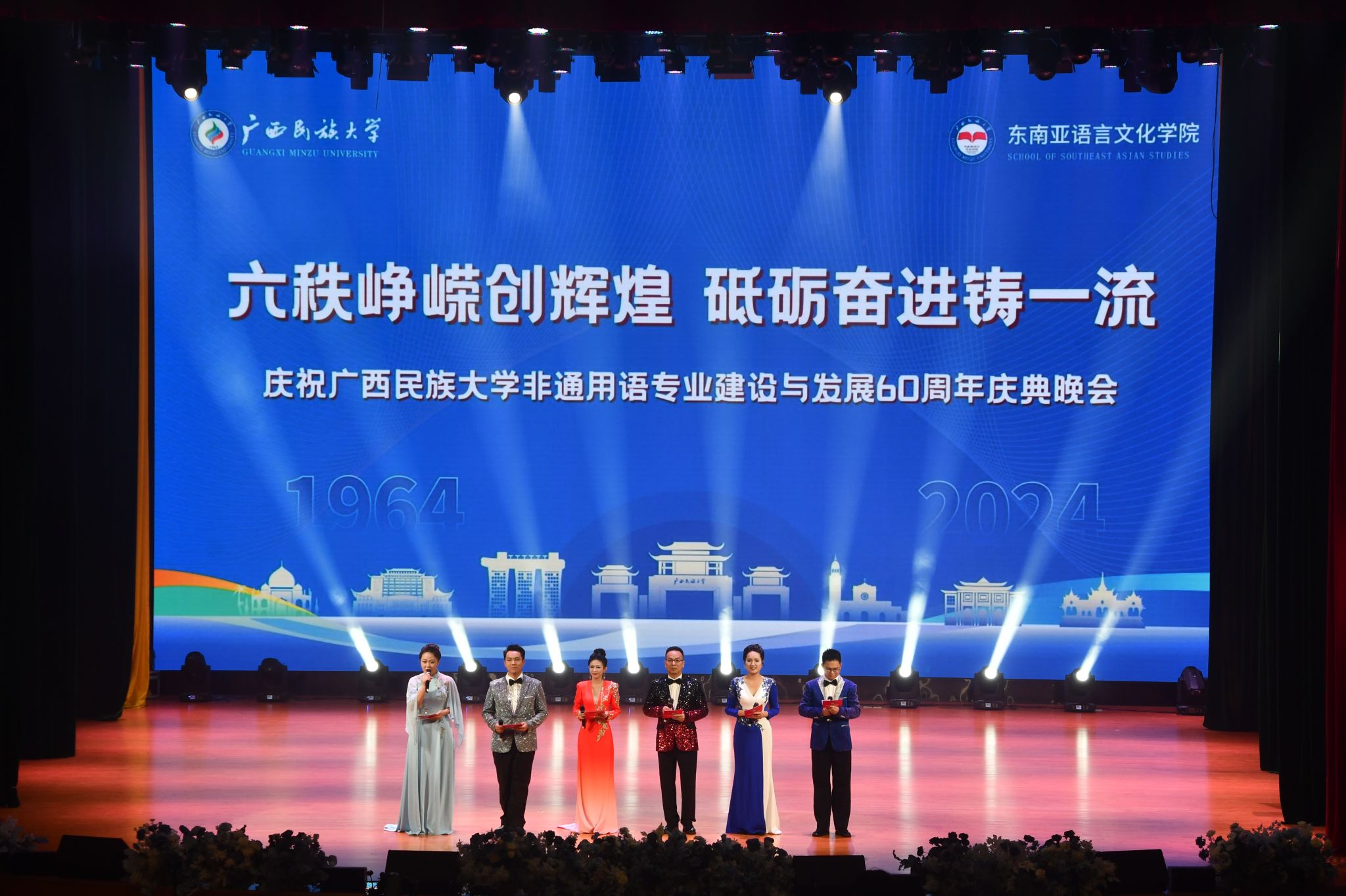 【大學生通訊社報道】11月3日晚,廣西民族大學非通用語專業建設與發展60周年慶典晚會在思源湖校區禮堂舉行。學校黨委副書記陳銘彬,教育部非通用語種類專業教學指導分委員會副主任委員陸生,國內各高校相關領域專家學者及東南亞語言文化學院師生、校友共同觀看晚會。
