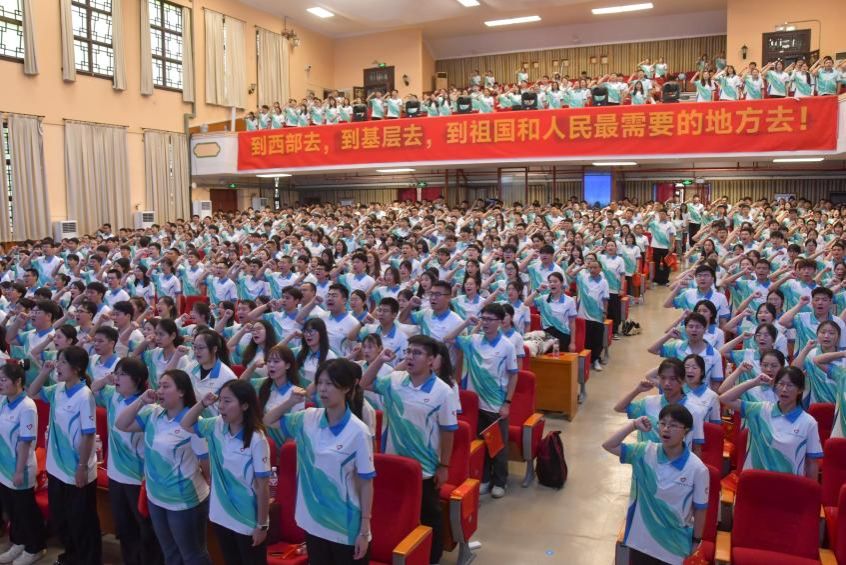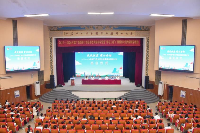 自治區教育廳、自治區財政廳、自治區人力資源社會保障廳、廣西青少年活動中心(廣西志愿者指導中心)、西部計劃各市項目辦、服務縣項目辦有關同志及855名廣西2025年新招募西部計劃志愿者參加出征儀式。(初審:吳家榮 復審:榮子卿 終審:孫壽媚)